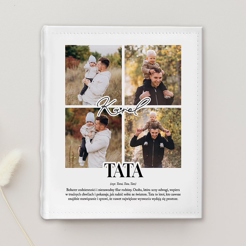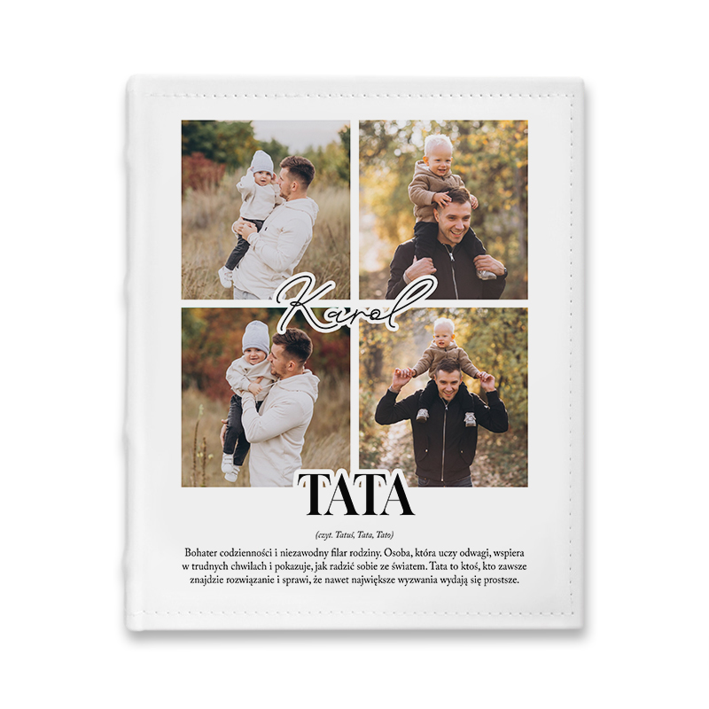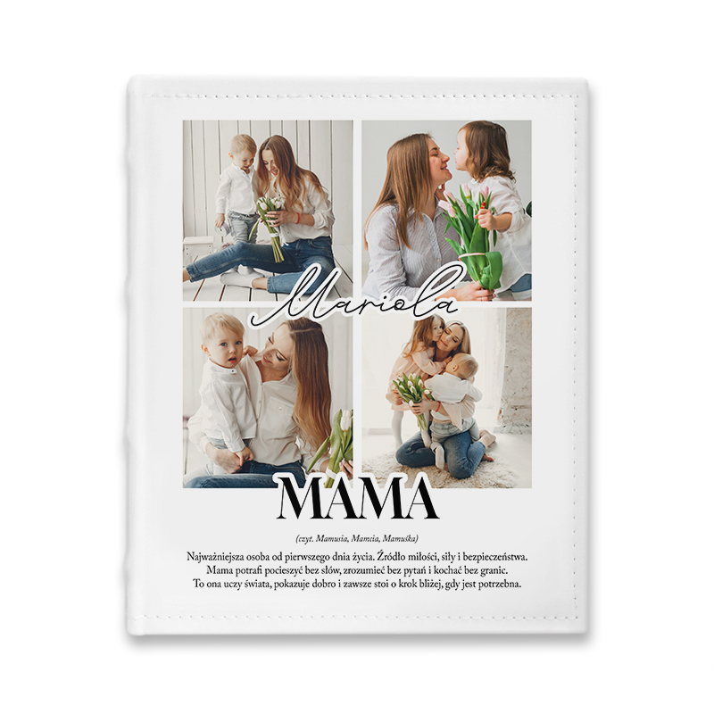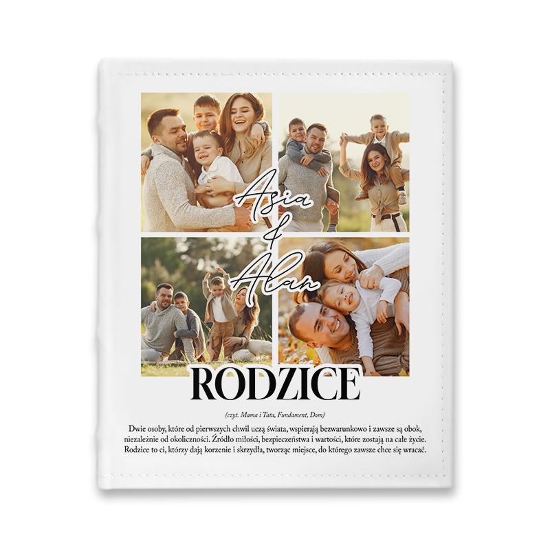 Okładka albumu utrzymana jest w jasnej, minimalistycznej stylistyce, z miejscem na cztery zdjęcia tworzące spójną kompozycję wspomnień. W centralnej części znajduje się imię lub imiona, które podlegają personalizacji, a poniżej wyraźny napis „Mama”, „Tata” lub „Rodzice” – w zależności od wybranego wariantu. Całość uzupełnia piękna, wzruszająca definicja opisująca rolę bliskich w życiu, nadając albumowi wyjątkowego znaczenia i emocjonalnej głębi.