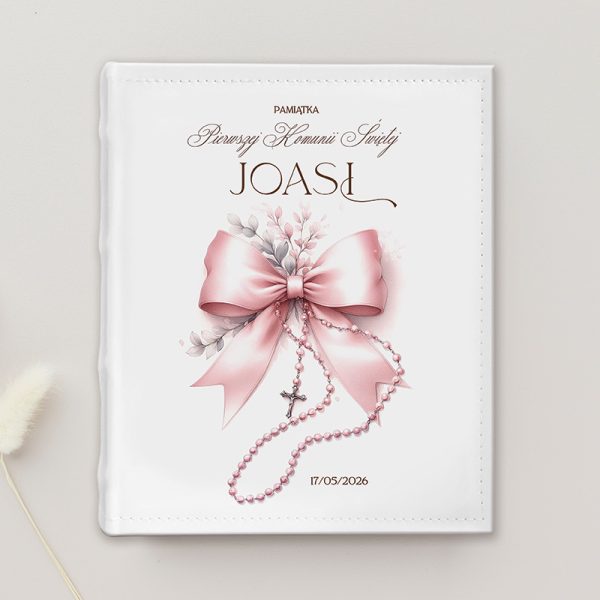 Elegancki i personalizowany album na zdjęcia komunijne z różową kokardą to wyjątkowa pamiątka Pierwszej Komunii Świętej dziewczynki. Idealny do zachowania wspomnień z Pierwszej Komunii Świętej.