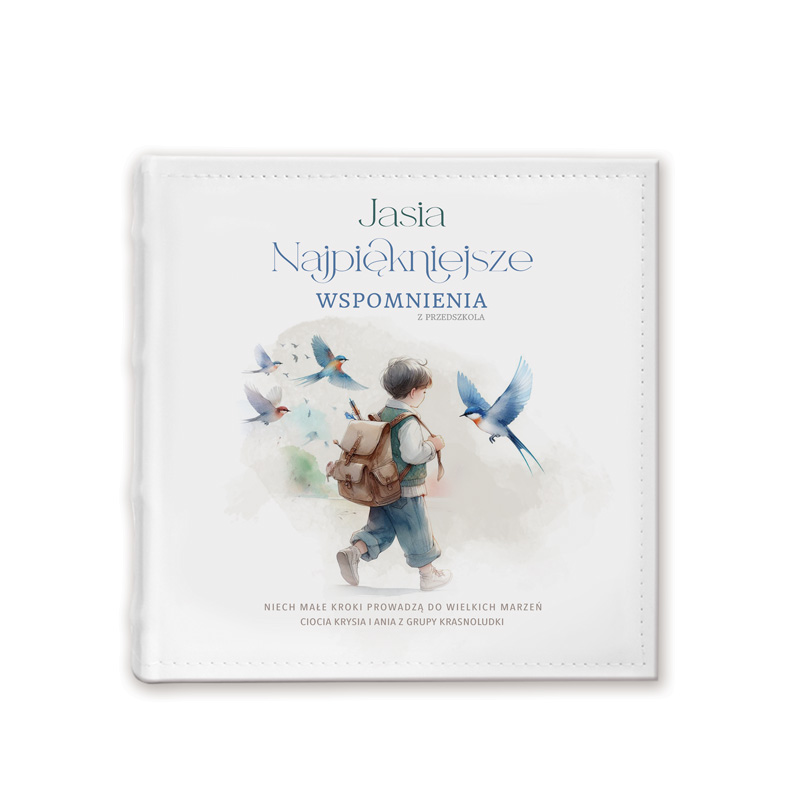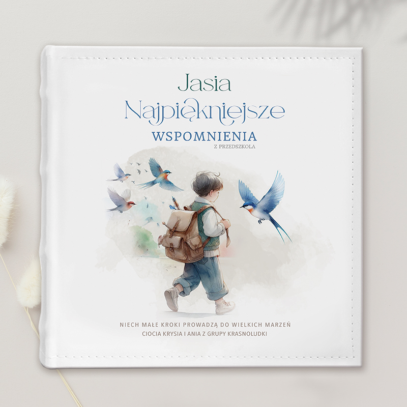 Personalizowany album kieszeniowy to wyjątkowy upominek dla przedszkolaka, który w piękny sposób pozwala zachować wspomnienia z pierwszych lat edukacji. To doskonały upominek od wychowawców, nauczycieli, rodziców czy dziadków, którzy chcą podkreślić wagę tego szczególnego momentu w życiu dziecka. Okładka albumu przedstawia chłopca z plecakiem w otoczeniu lecących ptaków, co symbolizuje początek nowej drogi, otwartość na świat i marzenia, które dopiero zaczynają się spełniać. Delikatna, pastelowa kolorystyka nadaje całości elegancki i ponadczasowy charakter. Dzięki personalizacji album staje się unikalną pamiątką, odzwierciedlającą indywidualny przekaz i wyjątkowe znaczenie chwili.