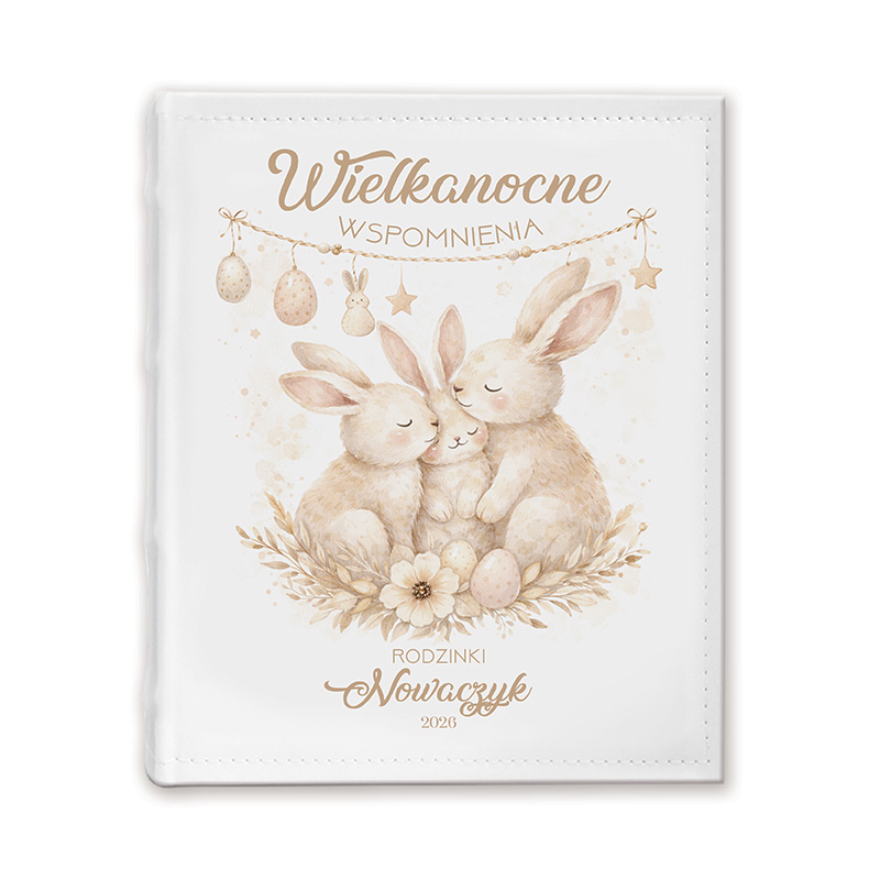 Okładka albumu utrzymana jest w jasnej, delikatnej kolorystyce i ozdobiona uroczą ilustracją przedstawiającą rodzinę wielkanocnych króliczków. Całość uzupełniają subtelne dekoracje, takie jak pisanki, girlanda oraz kwiatowe elementy, które nadają projektowi wiosennego i świątecznego charakteru. Na okładce znajduje się napis „Wielkanocne Wspomnienia”, a dodatkowo umieszczony jest podpis, który podlega personalizacji, dzięki czemu można dopasować produkt do konkretnej rodziny lub osoby.