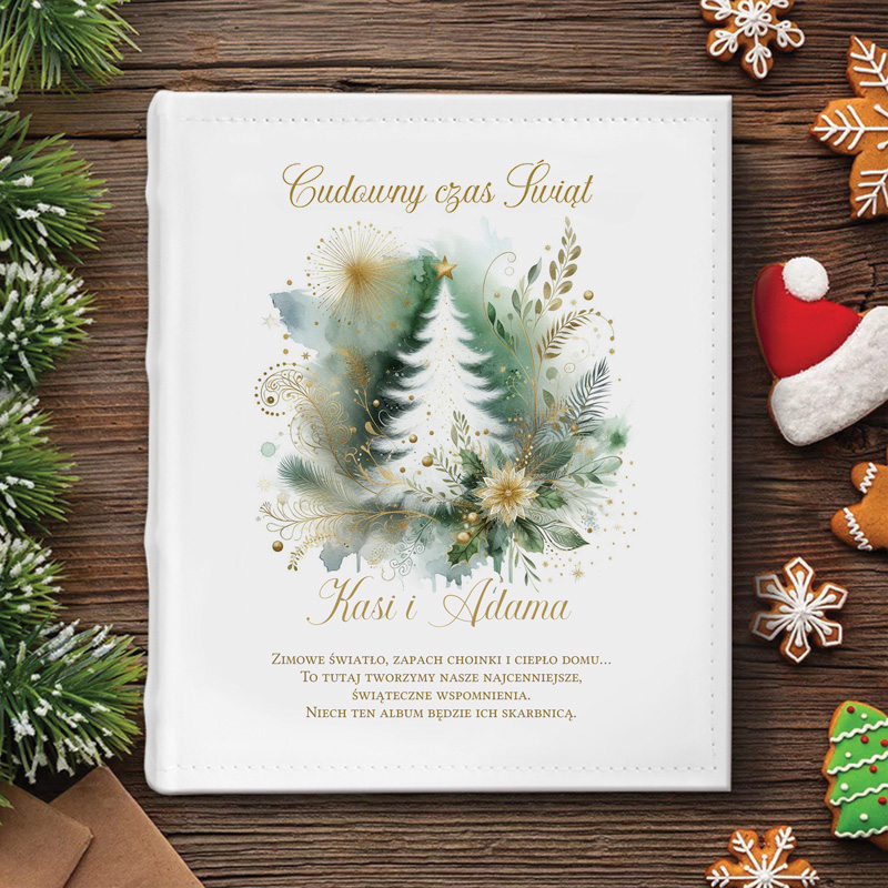 Album posiada białą okładkę ze świąteczną grafiką w stylu akwareli, przedstawiającą choinkę i ozdobne gałązki. Na okładce umieszczono personalizację imionami, co czyni z niego prezent indywidualny, dopasowany i pełen emocji. Dodatkowo album zawiera piękny tekst: „Zimowe światło, zapach choinki i ciepło domu… To tutaj tworzymy nasze najcenniejsze, świąteczne wspomnienia. Niech ten album będzie ich skarbnicą.” Album ma twardą oprawę w biały kolorze z eleganckiej ekoskóry, a w środku kryje grubsze karty do przyklejania zdjęć i zapisków. Między stronami znajduje się delikatny półpergamin, który dodatkowo zabezpiecza wklejone zdjęcia.