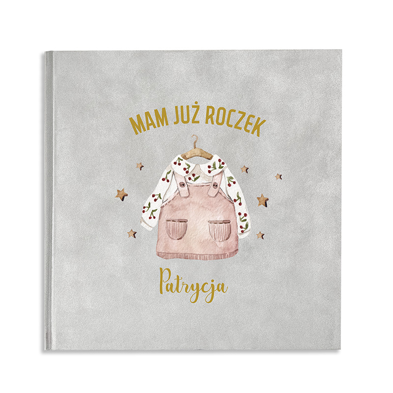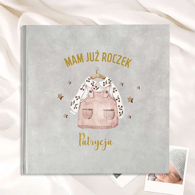 Ten wyjątkowy album z miękką, welurową okładką to nie tylko elegancki upominek, ale również cenna pamiątka, która pozwala zatrzymać najpiękniejsze wspomnienia z pierwszego roku życia dziecka. Dzięki personalizacji – imieniu umieszczonemu na froncie – album nabiera indywidualnego charakteru i staje się jedyny w swoim rodzaju. Okładkę zdobi urocza ilustracja dziecięcego ubranka, otoczona złotymi gwiazdkami, co nadaje całości subtelnego, dziecięcego uroku.