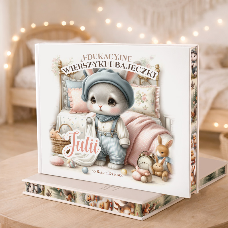 Okładka książki jest niezwykle przytulna i pełna uroku. W centralnej części widzimy uroczego króliczka ubranego w piżamkę. Dokładnie w błękitny berecik i ogrodniczki w paski, który trzyma delikatny kocyk. Króliczek siedzi w otoczeniu pięknie zaaranżowanego pokoju dziecięcego. W tle znajduje się zaścielone łóżko z różową narzutą i ozdobnymi poduszkami. Całość utrzymana jest w delikatnych pastelowych odcieniach, które nadają okładce elegancji i ciepła. Na górze okładki znajduje się tytuł Edukacyjne Wierszyki i Bajeczki zapisany ozdobną czcionką. Poniżej umieszczono miejsce na personalizowane imię dziecka. Na dole znajduje pole na podpis, co nadaje książce bardzo osobisty charakter, czyniąc ją jeszcze bardziej wyjątkowym upominkiem. Dodatkowo książka posiada piękne zdobione brzegi, dzięki czemu prezentuje się niezwykle efektownie.