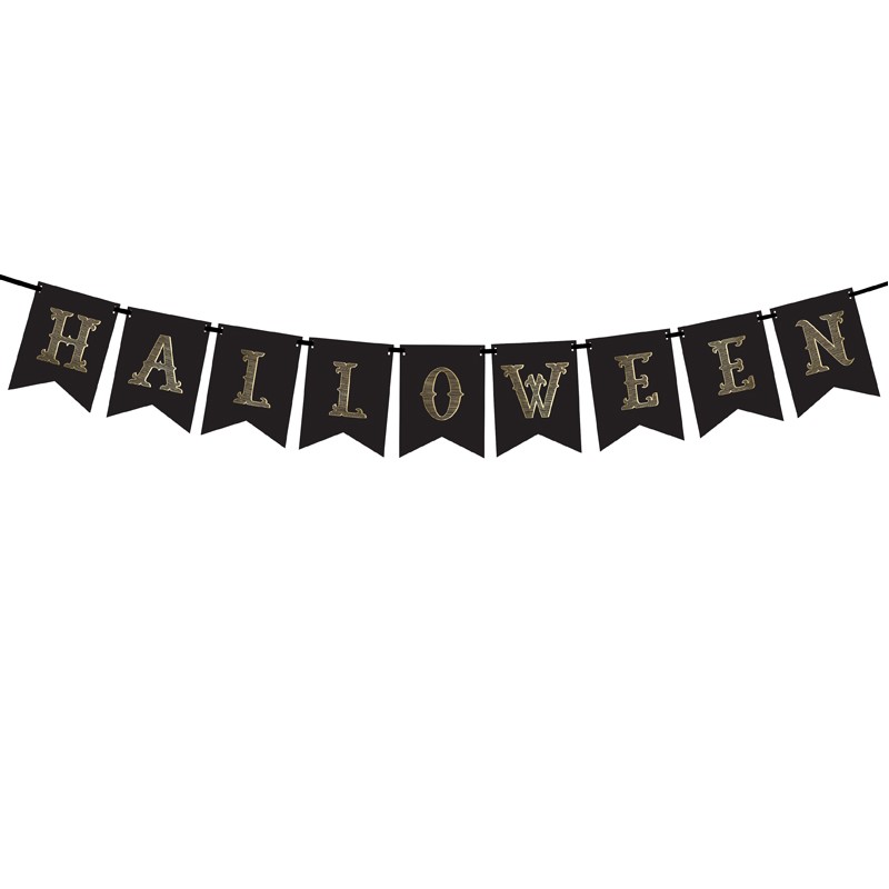 Baner składa się z dziewięciu czarnych chorągiewek z dużymi, złotymi literami tworzącymi napis HALLOWEEN. Każdy element wykonany jest z trwałego, sztywnego papieru, dzięki czemu dekoracja wygląda efektownie i może być wykorzystana wielokrotnie. Baner ma uniwersalny rozmiar i jest łatwy do zawieszenia. Można go umieścić nad stołem, przy wejściu, na ścianie lub w ogrodzie. Czarno-złote połączenie kolorów sprawia, że dekoracja jest zarówno elegancka, jak i mroczna, idealna na imprezę dla dorosłych i dzieci.