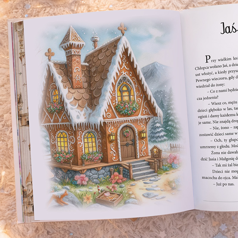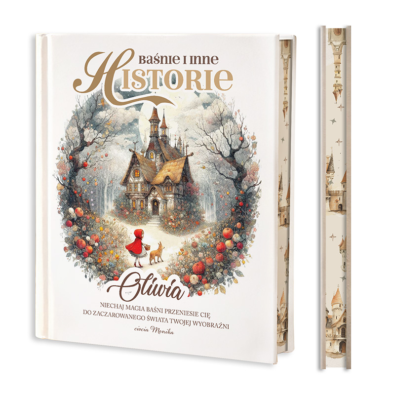 Książka została oprawiona w solidną, twardą okładkę, dzięki czemu prezentuje się niezwykle estetycznie i jest trwała podczas codziennego użytkowania. Na okładce znajduje się ilustracja inspirowana światem baśni oraz imię dziecka podlegające personalizacji, co sprawia, że książka staje się wyjątkowym i bardzo osobistym prezentem. Dodatkowego uroku dodają pięknie barwione, kolorowe brzegi stron, które nadają księdze elegancki i dekoracyjny charakter. Nadruk wykonywany jest nowoczesną metodą UV, dzięki czemu grafika jest wyraźna i odporna na ścieranie.