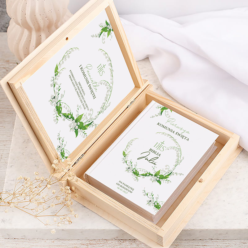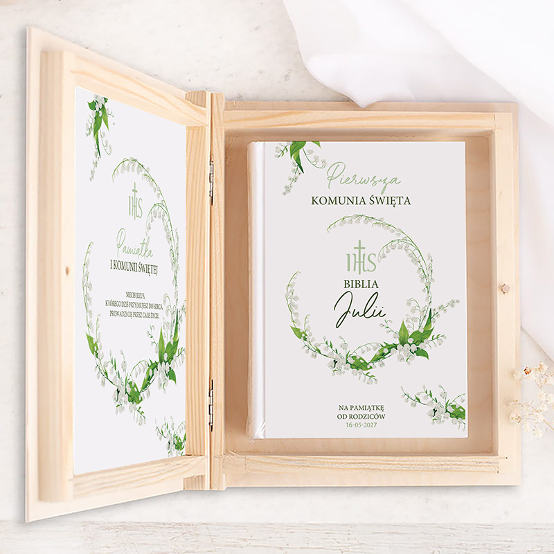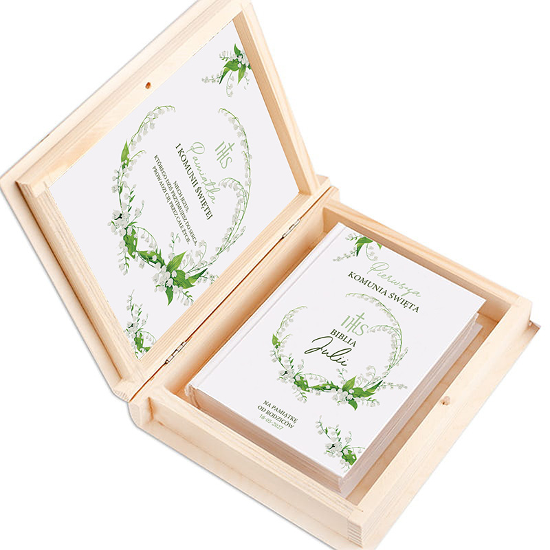 W skład zestawu wchodzi Biblia komunijna oraz drewniane pudełko wykonane z naturalnego drewna. Na wewnętrznej stronie wieczka znajduje się ozdobna wklejka z motywem zielonego wianka z konwalii. W środku pudełka umieszczona zostanie ilustrowana biblia na której okładce znajduje się personalizacja imieniem dziecka i datą uroczystości. Całość tworzy spójny i elegancki zestaw.