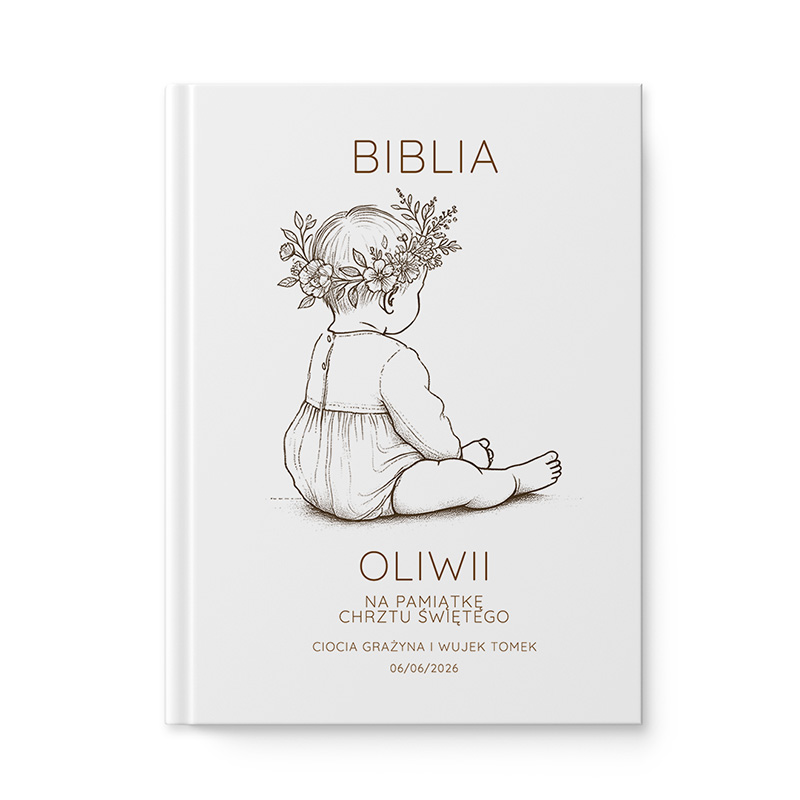 Twarda biała okładka ozdobiona została delikatnym rysunkiem dziewczynki w uroczym ubranku, siedzącej tyłem z kwiatowym wiankiem na głowie. Na okładce znajduje się również personalizowany napis zawierający imię dziecka, podpis oraz datę chrztu. Dzięki temu Biblia staje się niepowtarzalną pamiątką. Wewnątrz znajduje się treść Pisma Świętego opracowana w sposób przyjazny dla młodszych odbiorców. Biblia posiada również piękne ilustracje. Biblia będzie pięknym wstępem do duchowego rozwoju dziecka, a także doskonałą okazją do wspólnego czytania z rodzicami, dziadkami czy chrzestnymi.