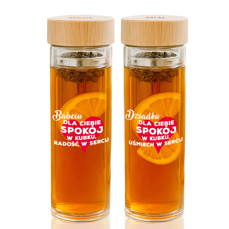 Bidon wykonany jest ze szkła z podwójnymi ściankami, które pozwalają utrzymać temperaturę napojów nawet do 4 godzin. To doskonały wybór na chłodne dni. Wewnątrz znajduje się stalowy zaparzacz, który umożliwia parzenie herbaty liściastej lub ziół bez konieczności używania dodatkowych akcesoriów. Wyjmowane sitko sprawia, że użytkowanie bidonu jest łatwe i przyjemne. Na froncie każdego bidonu znajduje się dedykacja:  „Babciu, dla Ciebie spokój w kubku, radość w sercu” lub „Dziadku, dla Ciebie spokój w kubku, uśmiech w sercu”. Dodatkowym atutem jest bambusowa zakrętka z wygrawerowanym imieniem.