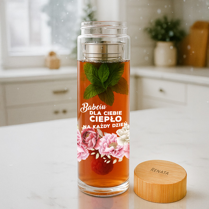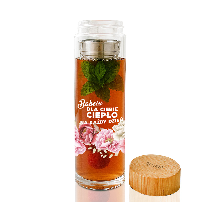 Butelka wykonana jest ze szkła, dzięki podwójnym ściankom, bidon utrzymuje temperaturę płynu aż do 4 godzin. To idealne rozwiązanie na herbatę, napar lub aromatyczną kawę. Wewnątrz bidonu znajduje się stalowe sitko, które umożliwia wygodne parzenie ulubionych napojów. Sitko jest łatwe do wyjęcia, co ułatwia czyszczenie. Dodatkowo bidon posiada wyjątkową grafikę – napis „Babciu, dla Ciebie ciepło na każdy dzień” oraz motyw pastelowych kwiatów. Całość dopełnia elegancka bambusowa zakrętka z personalizacją imienia.