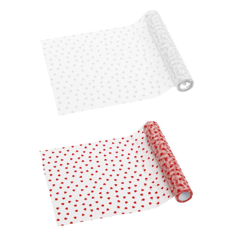 Bieżnik wykonany jest z transparentnego tiulu. Całość pokryta jest drobnymi serduszkami w kolorze czerwonym lub białym. Możesz wybrać wersję kolorystyczną pasującą do motywu przewodniego imprezy – czerwona będzie idealna na urodziny w stylu bajkowym, biała z kolei świetnie sprawdzi się przy delikatniejszych aranżacjach, np. pastelowych.