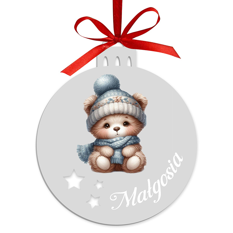 Bombka akrylowa z imieniem została wykonana z przejrzystego, gładkiego akrylu. Na środku umieszczony jest słodki miś w zimowym ubranku – miękki szalik oraz czapka z pomponem w chłodnych, niebieskich odcieniach nadają grafice przytulny, zimowy klimat. Imię dziecka nadrukowane jest dekoracyjną, czytelną czcionką w dolnej części zawieszki, dzięki czemu napis dobrze prezentuje się nawet z większej odległości. Przezroczyste tło sprawia, że ozdoba choinkowa harmonijnie wtapia się w gałązki drzewka, a grafika pozostaje wyraźna i estetyczna. Co więcej, lekki materiał powoduje, że zawieszka nie obciąża gałązek i jest bezpieczny także dla młodszych dzieci, które lubią oglądać bombki z bliska.