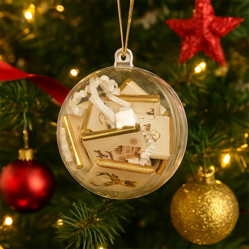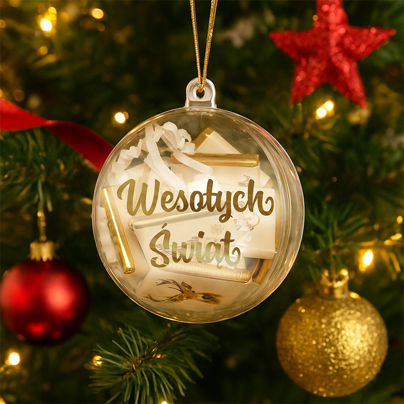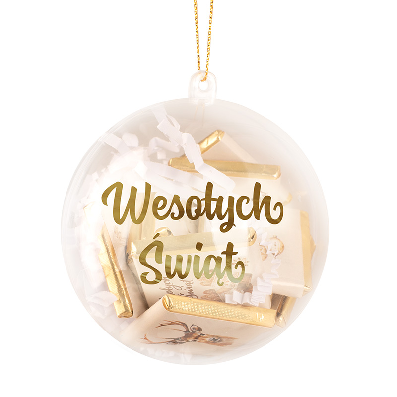 Przezroczysta bombka została wykonana z lekkiego tworzywa, dzięki czemu pięknie prezentuje się na choince i nie obciąża gałązek. Wewnątrz znajduje się 12 sztuk świątecznych czekoladek zawiniętych w eleganckie papierki – ich wzór dobierany jest losowo, ale zawsze utrzymany w świątecznej kolorystyce. Na jednej ze stron bombki widnieje złoty napis „Wesołych Świąt”, który dodaje całości blasku i świątecznego uroku. Bombka zamykana jest w formie dwóch półkul i przewiązana dekoracyjną kokardką – kolor wstążki możesz wybrać samodzielnie, dopasowując ją do pozostałych dekoracji lub upodobań osoby obdarowanej.