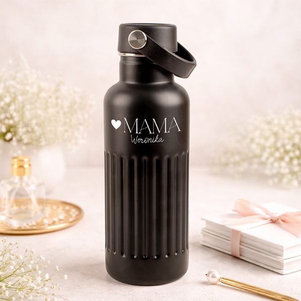 Butelka wyróżnia się eleganckim, czarnym kolorem oraz modnym, ryflowanym wykończeniem, które nadaje jej nowoczesnego charakteru. Na froncie znajduje się subtelny napis „Mama” uzupełniony serduszkiem oraz miejsce na personalizację w postaci imienia. Całość dopełnia wygodna zakrętka z uchwytem, która ułatwia przenoszenie i użytkowanie na co dzień.