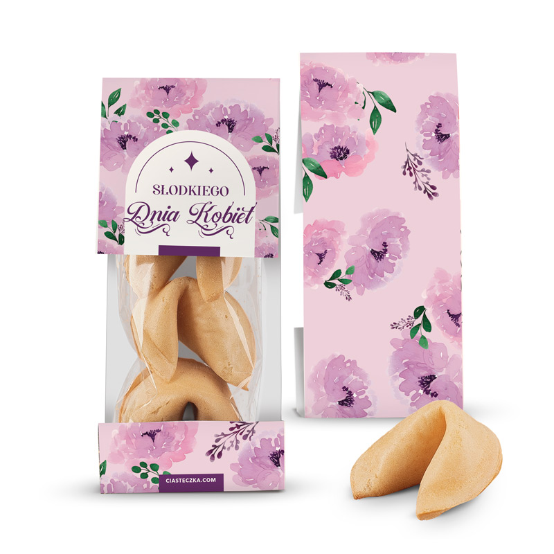 Ciasteczka umieszczone są w eleganckim, dekoracyjnym opakowaniu z motywem różowo-fioletowych kwiatów oraz napisem nawiązującym do Dnia Kobiet. Delikatna kolorystyka i florystyczny wzór nadają całości kobiecego, wiosennego charakteru. Przez przezroczystą część opakowania widać ciasteczka, co dodatkowo podkreśla ich apetyczny wygląd i sprawia, że całość prezentuje się jak mały, gotowy prezencik. W środku znajdują się klasyczne ciasteczka z wróżbą, które kryją w sobie krótkie sentencje lub miłe hasła. To element zaskoczenia, który sprawia, że słodycz staje się także formą zabawy i integracji – uczennice mogą wspólnie odczytywać swoje wróżby, co buduje miłą, lekką atmosferę podczas szkolnych obchodów.