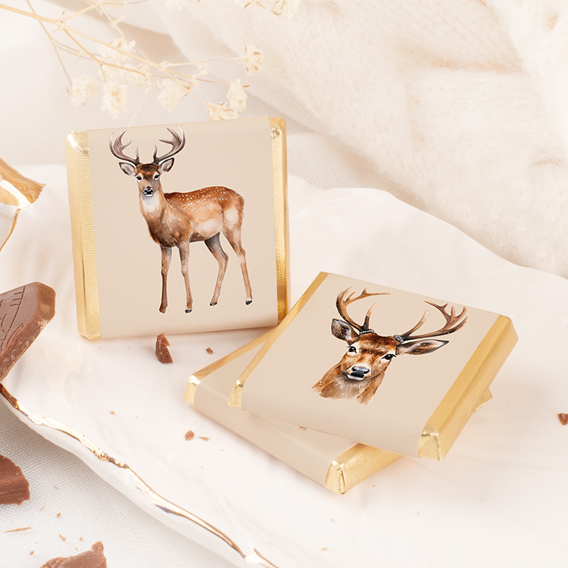 Każda czekoladka owinięta jest w dekoracyjny papier z motywami zimowymi – znajdziesz na nich między innymi renifery, choinki, prezenty, śnieżynki i inne ilustracje w naturalnej, pastelowej kolorystyce. Dodatkowym akcentem są złote brzegi, które dodają elegancji i sprawiają, że nawet pojedyncza sztuka wygląda wyjątkowo. Wzór czekoladki dobierany jest losowo, co czyni każdą z nich małą niespodzianką. To mleczna, klasyczna słodycz, która przypadnie do gustu zarówno dzieciom, jak i dorosłym.