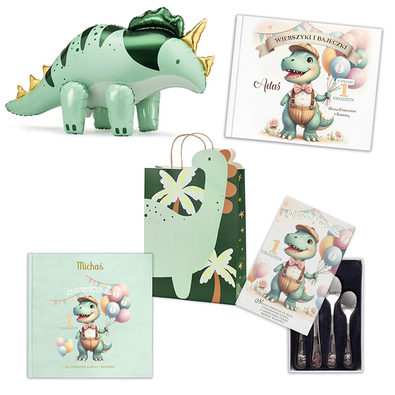Komplet uzupełniają sztućce z grawerowanym imieniem i drobnymi zdobieniami w formie zwierzątek, zapakowane w pudełko ozdobione grafiką dinozaura i pastelowych balonów. W zestawie znalazł się także duży balon foliowy w kształcie zielonego triceratopsa ze złotymi akcentami, który po napełnieniu helem lub powietrzem stanie się efektowną ozdobą przyjęcia. Całość dopełnia papierowa torba prezentowa z motywem dinozaurów i roślin tropikalnych, ułatwiająca eleganckie wręczenie upominku. To propozycja stworzona z myślą o roczku dziecka – ekskluzywna, spójna wizualnie i przygotowana tak, by zachwycić każdego małego miłośnika dinozaurów.