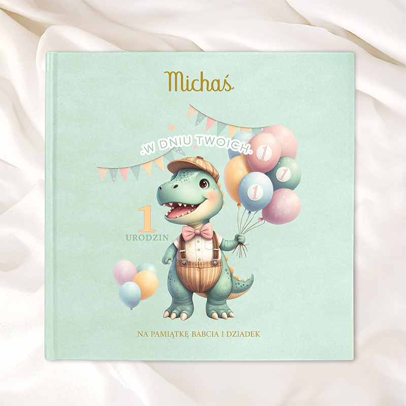 Ekskluzywny Zestaw Prezentowy na Roczek Dziecka z Dinozaurem to personalizowany album, książeczka, sztućce, balon i torba prezentowa przygotowane w spójnej stylistyce z motywem dinozaura.