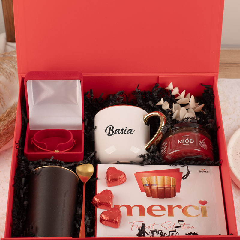 Zestaw prezentowy dla mamy to idealny pomysł na upominek z okazji Dnia Matki. W eleganckim pudełku z imieniem znajduje się personalizowany kubek, złota łyżeczka, aromatyczna herbata, naturalny miód, czekoladki Merci i serduszka, a także delikatna bransoletka w pudełeczku. To gotowy do wręczenia prezent, który wyraża wdzięczność, miłość i troskę.