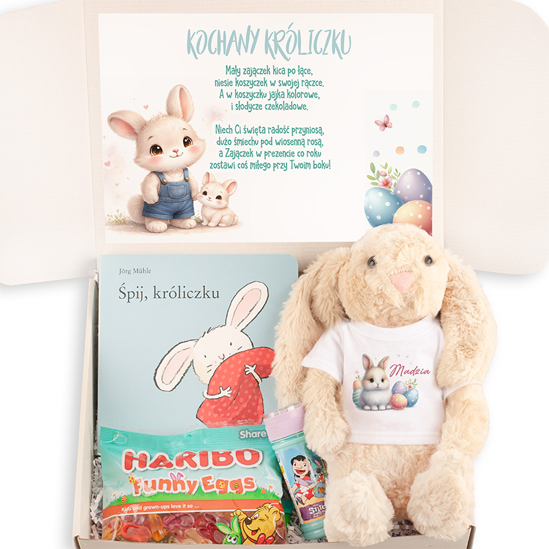 W zestawie znalazł się uroczy pluszowy zajączek z imieniem dziecka. Maskotka jest miękka i przyjemna w dotyku. Zajączek ubrany jest dodatkowo w koszulkę z wielkanocną grafiką oraz personalizowanym imieniem dziecka. W zestawie znajduje się również książeczka dla dzieci „Śpij, króliczku”. To miła i spokojna opowieść idealna do wspólnego czytania przed snem. Paczka zawiera także słodką przekąskę w postaci owocowych żelków. Dodatkowo w zestawie znajdują się bańki mydlane, idealne do zabawy na świeżym powietrzu.