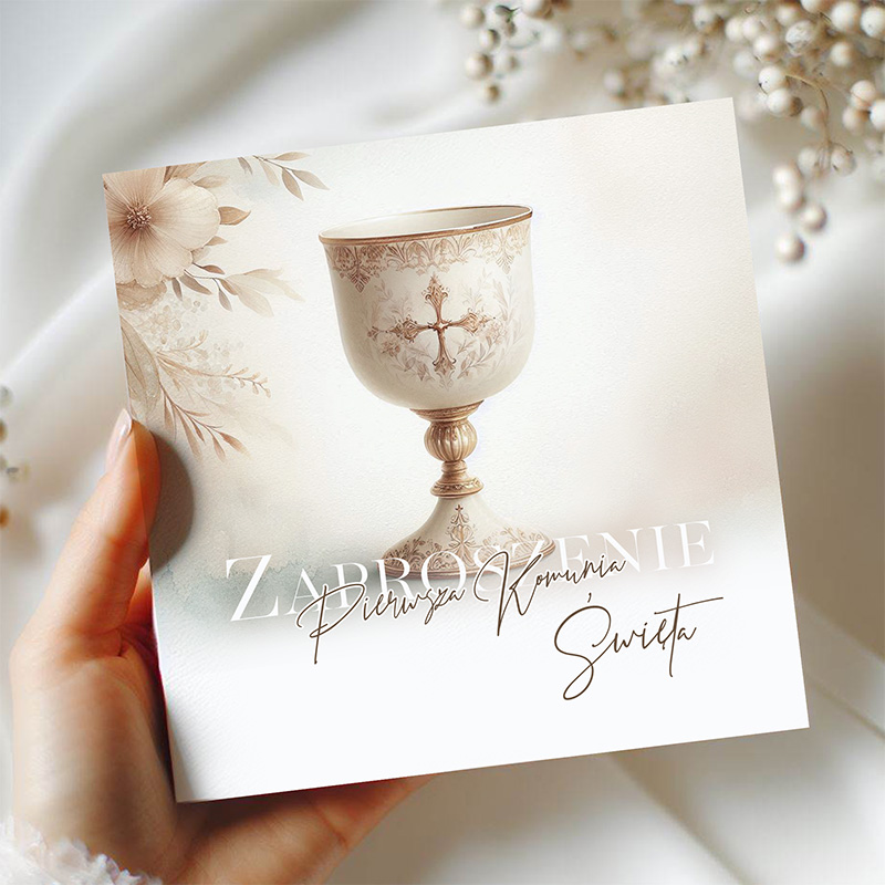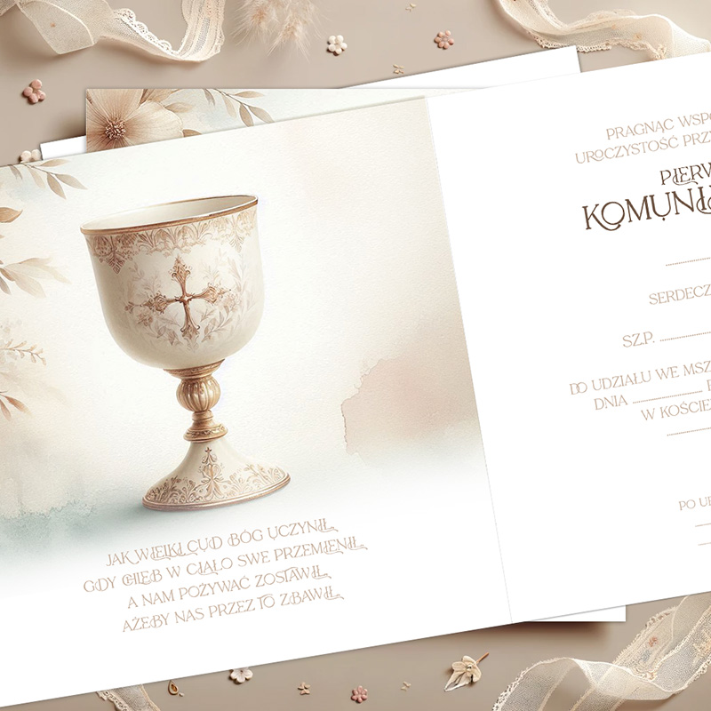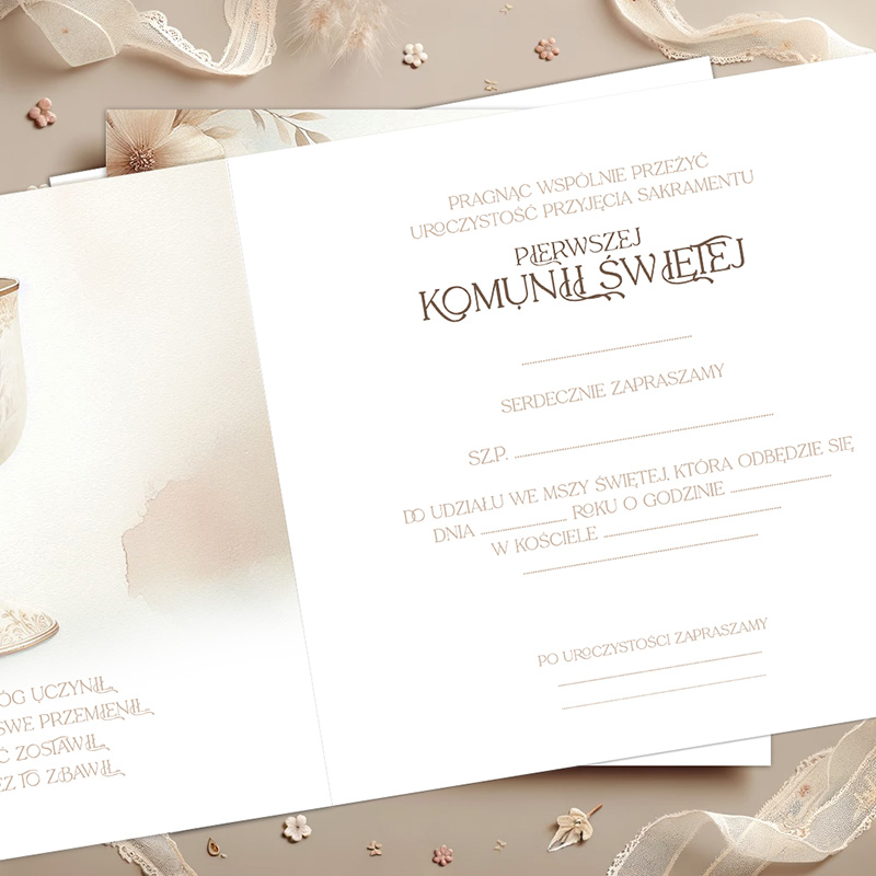 Front zaproszenia utrzymany jest w delikatnej, naturalnej kolorystyce beżu i złota. Centralnym elementem grafiki jest stylowy kielich komunijny ozdobiony subtelnym ornamentem, który symbolicznie nawiązuje do sakramentu Eucharystii. Całość uzupełniają kwiatowe motywy oraz elegancki napis „Zaproszenie Pierwsza Komunia Święta” wykonany dekoracyjną czcionką. Zaproszenia są gotowe do samodzielnego uzupełnienia, dzięki czemu można łatwo wpisać wszystkie informacje dotyczące uroczystości.