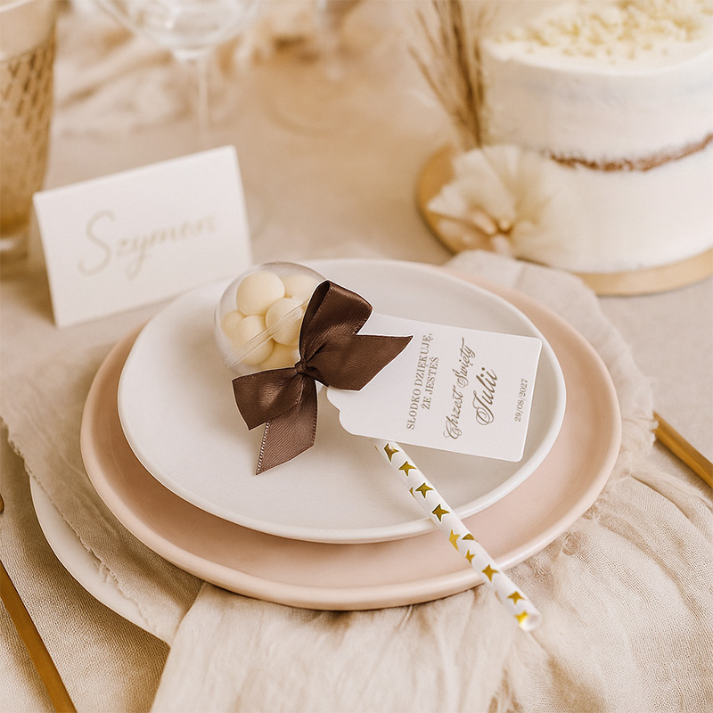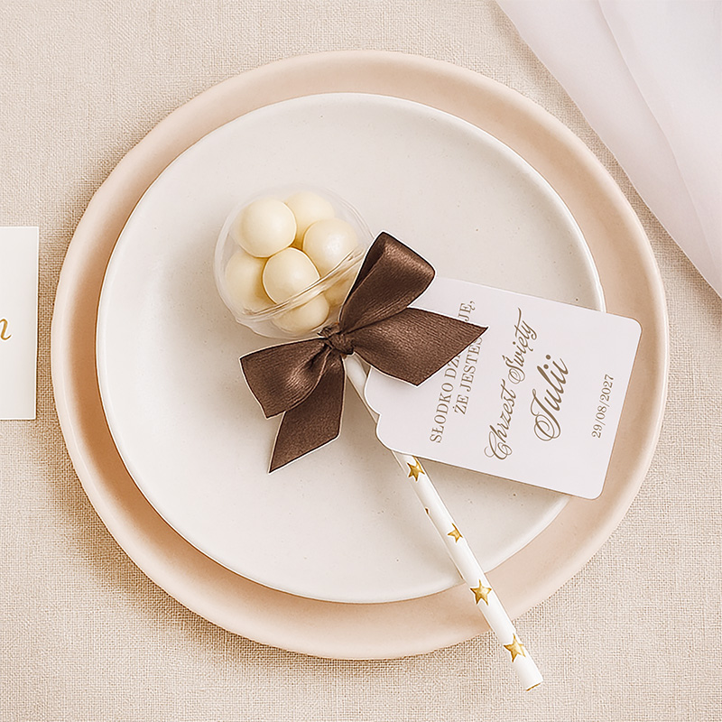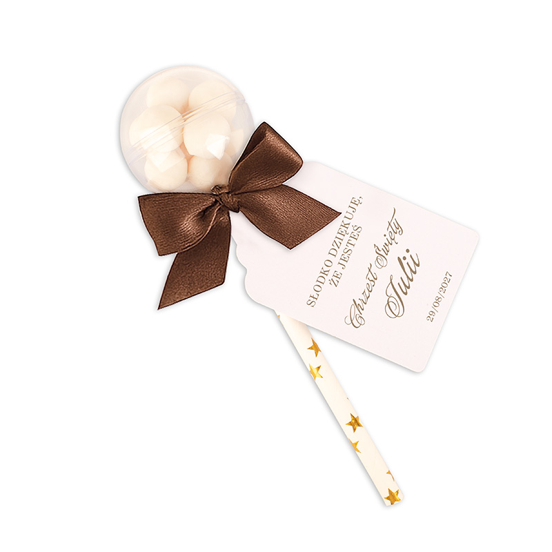 Cukierkowa grzechotka składa się z transparentnej plastikowej kulki, w której znajdują się białe drażetki. Grzechotkę osadzono na papierowej słomce ozdobionej złotymi gwiazdkami. Całość została dodatkowo ozdobiona ciemnobrązową kokardką, która pięknie kontrastuje z jasnymi elementami i nadaje grzechotce elegancki charakter. Do grzechotki dołączony jest również bilecik z personalizacją. Na bileciku znajduje się napis: „Słodko dziękuję, że jesteś. Chrzest Święty [imię]’”, uzupełniony o datę uroczystości.