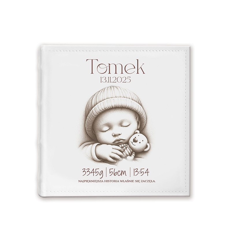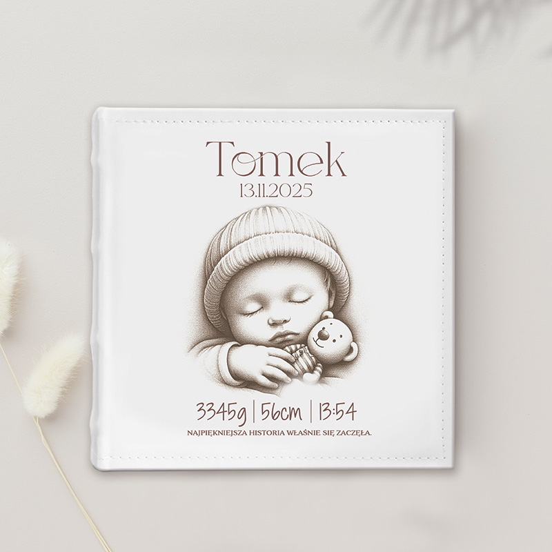 Personalizowany kieszeniowy album na zdjęcia z metryczką to wyjątkowy prezent na narodziny dziecka, który w piękny sposób przechowa wspomnienia z pierwszych chwil życia maluszka. Subtelna okładka przedstawia śpiące dziecko tulące pluszowego misia, a całość utrzymana jest w delikatnej, minimalistycznej stylistyce. Personalizacja obejmuje dane z metryczki – imię, datę narodzin, wagę, wzrost oraz godzinę narodzin – dzięki czemu album staje się jedyną w swoim rodzaju pamiątką rodzinną.