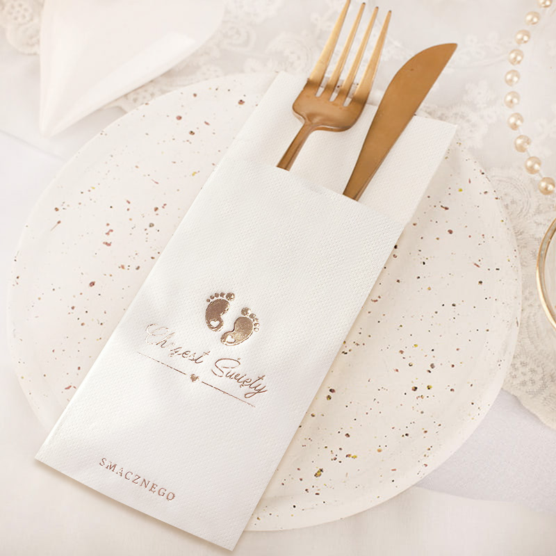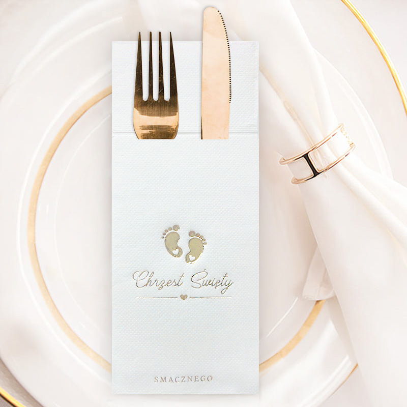 Eleganckie kieszonki na sztućce to idealny element, który urozmaici dekorację stołu podczas uroczystości Chrztu Świętego, nadając mu świeżości i nowoczesnego wyglądu. Modny motyw złoconych dziecięcych stópek, będący częścią kolekcji Małe Stópki, prezentuje się zarówno nowocześnie, jak i efektownie.