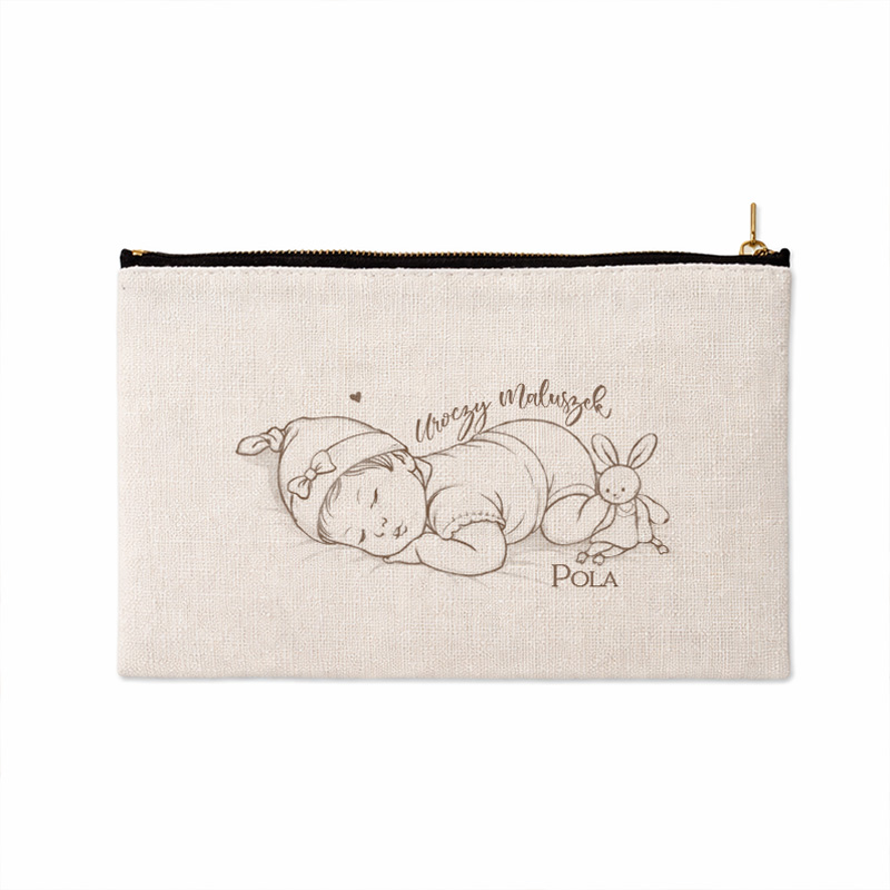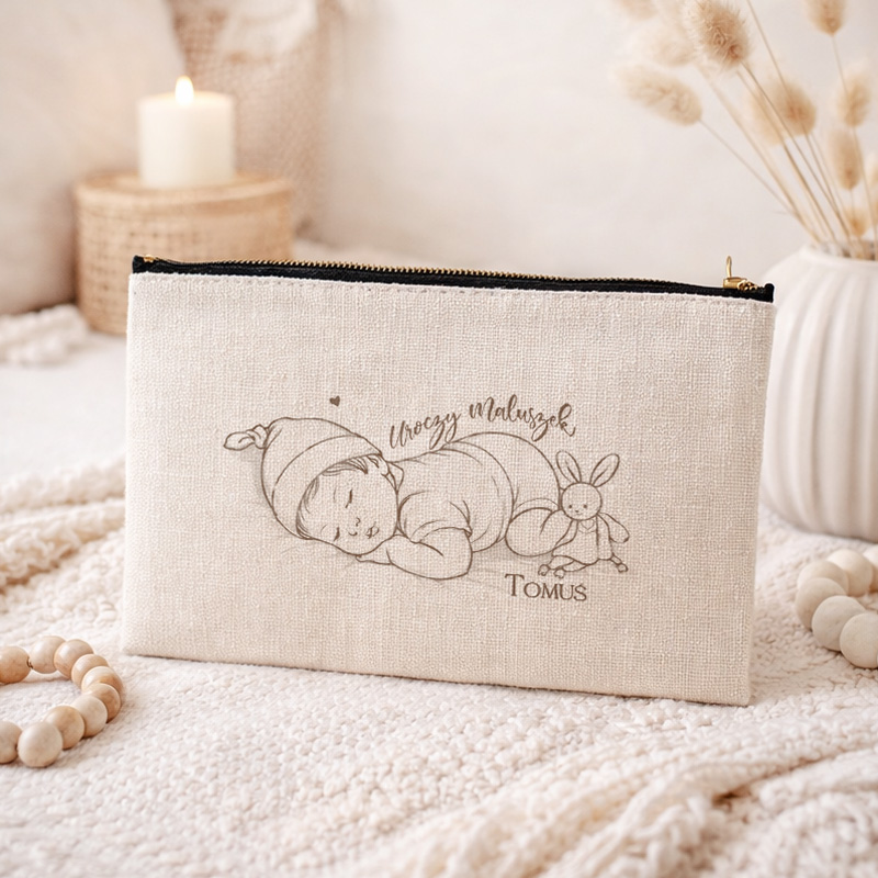 Lniana kosmetyczka personalizowana na przybory niemowlęce to praktyczny i stylowy organizer dla mamy. Delikatna grafika śpiącego maluszka oraz imię dziecka tworzą wyjątkowy, funkcjonalny dodatek na co dzień i w podróży.