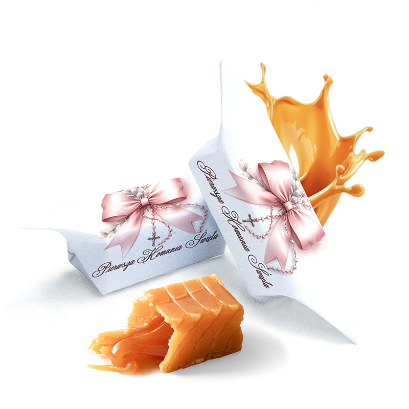 Na opakowaniu krówek widoczna jest ilustracja w postaci różowej kokardy oraz różańca. Całość uzupełnia napis „Pierwsza Komunia Święta”, zaprojektowany w dekoracyjnej czcionce. Krówki produkowane są w Polsce i zachwycają tradycyjnym, mlecznym smakiem, dzięki czemu są idealnym smacznym i eleganckim upominkiem dla gości komunijnych. Zestaw o wadze 1 kg zawiera około 85 krówek. Taki upominek świetnie sprawdzi się jako dodatek do pamiątkowych pudełeczek, woreczków z organzy czy jako słodka dekoracja stołu.
