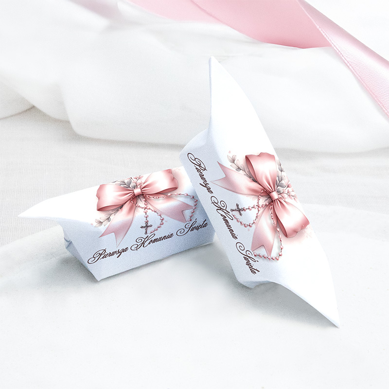 Krówki komunijne z grafiką różowej kokardy są dedykowane dla dziewczynki i doskonale komponują się z innymi dodatkami w pastelowych kolorach. Idealnie sprawdzą się jako upominek wręczany po zakończonej uroczystości, podczas obiadu komunijnego lub przy powitaniu gości. Krówki komunijne z różową kokardą to słodkie podziękowanie dla gości na Pierwszą Komunię Świętą dziewczynki, które łączy klasyczny smak z wyjątkowym wyglądem.