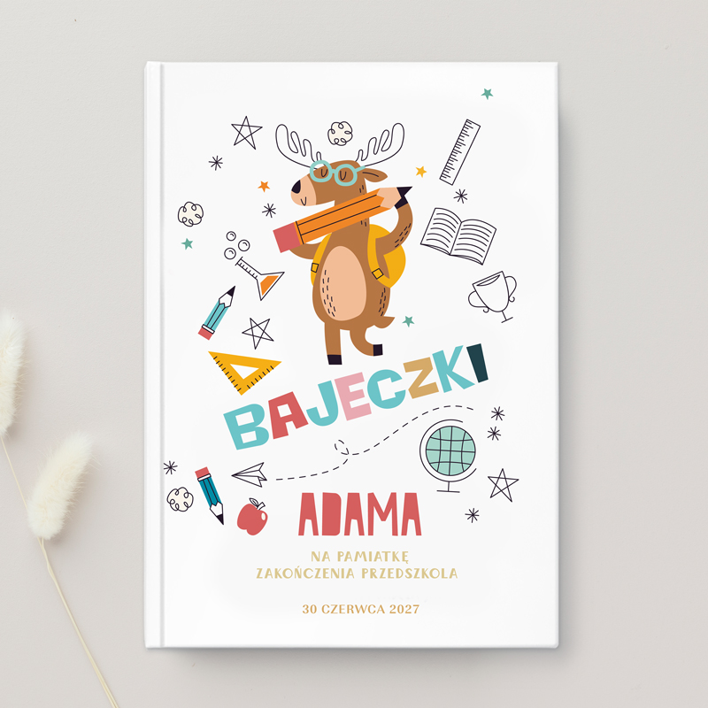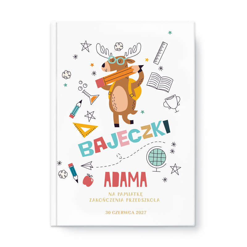 Okładka kolorowej książki z tytułem «BAJECZKI» i imieniem «ADAMA», przedstawiająca rysunkowego łosia w okularach z plecakiem, trzymającego kredę. W tle różne elementy związane z nauką, jak książki, globus i przybory szkolne. Data: 30 czerwca 2028 r.