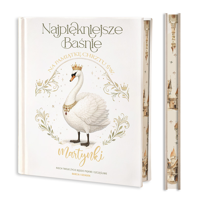 Książka posiada solidną twardą oprawę, która nadaje jej elegancki i trwały charakter. Okładkę zdobi subtelna ilustracja dostojnego łabędzia w złotej koronie, otoczona dekoracyjnymi ornamentami w delikatnej, królewskiej stylistyce. Na okładce znajduje się personalizowane imię dziecka, dzięki czemu książka staje się wyjątkową pamiątką. Nadruk wykonujemy nowoczesną metodą UV, co zapewnia trwałość i wysoką jakość detali. Książka wyróżnia się również pięknie barwionymi, kolorowymi brzegami stron. W środku znajduje się 13 baśni autorstwa Hansa Christiana Andersena oraz Braci Grimm, uzupełnionych kolorowymi ilustracjami oraz jedną kreatywną kolorowanką dla dziecka.