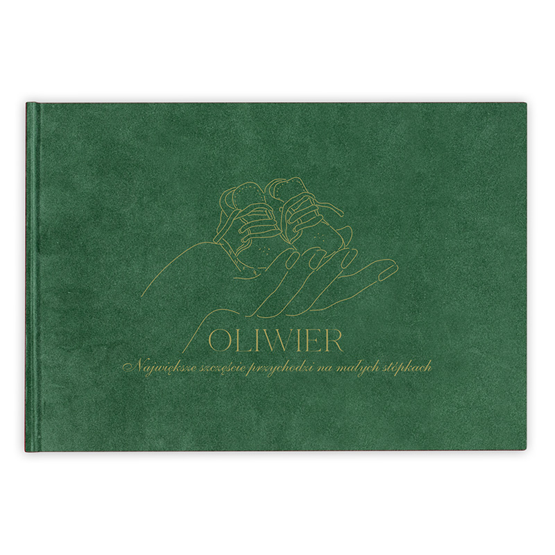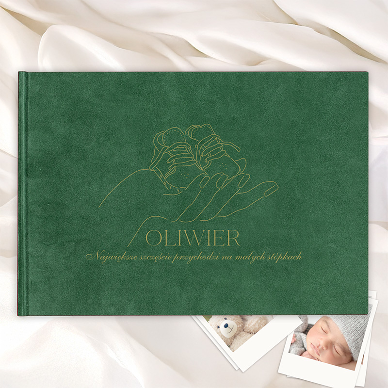 Okładka albumu wyróżnia się minimalistycznym, eleganckim stylem, który doskonale oddaje delikatność i wyjątkowość pierwszych chwil życia dziecka. Wykonana z wysokiej jakości weluru, jest miękka i aksamitna w dotyku, co dodaje jej luksusowego charakteru. Na froncie znajduje się złocony, artystyczny rysunek, przedstawiający dłoń trzymającą malutkie dziecięce buciki. Ten wzruszający detal symbolizuje miłość, troskę i pierwsze kroki nowego życia. Tuż pod ilustracją widnieje personalizowane imię dziecka, zapisane elegancką, złotą czcionką, co czyni album jedynym w swoim rodzaju. Dodatkowym elementem ozdobnym jest delikatny, złoty napis „Największe szczęście przychodzi na małych stópkach”, który nadaje całości jeszcze bardziej sentymentalnego charakteru. Wewnątrz znajduje się miejsce na najpiękniejsze zdjęcia i wspomnienia z pierwszych dni życia maluszka, które rodzice będą mogli zachować na długie lata. Jest to album na wklejane zdjęcia, co pozwala na pełną dowolność w ich rozmieszczeniu oraz kreatywne uzupełnianie stron o notatki, dedykacje czy pamiątkowe dodatki.