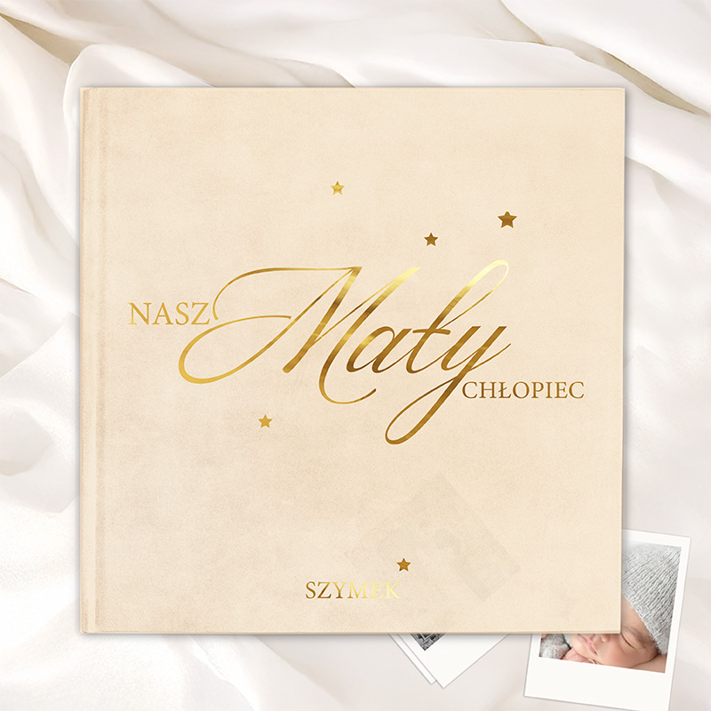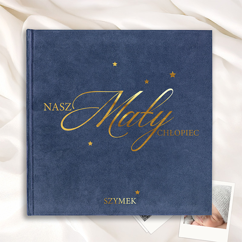 Księga welurowa została stworzona o chłopcach, których wspomnienia zasługują na specjalną oprawę. Okładka wykonana z miękkiego weluru emanuje subtelną elegancją i jest miła w dotyku, co czyni ją jeszcze bardziej wyjątkową. Na froncie widnieje starannie wykonany napis “Nasz Mały Chłopiec” w eleganckiej, złotej czcionce, dodając całości ekskluzywnego wyglądu. Personalizowany dodatek w postaci imienia dziecka umieszczonego na dole księgi nadaje jej indywidualny charakter. Złote gwiazdki rozproszone wokół tekstu, wprowadzają delikatny akcent, który sprawia, że księga wygląda jak małe dzieło sztuki. W środku księgi znajduje się wiele stron, które można wypełniać wpisami, zdjęciami czy odciskami rączek i stópek dziecka, a także notatkami z ważnych wydarzeń takich jak pierwszy uśmiech, pierwszy krok czy urodziny. Możliwość dowolnego wypełnienia wnętrza sprawia, że to idealne miejsce do przechowywania wspomnień w formie, która będzie cieszyć oko przez lata.