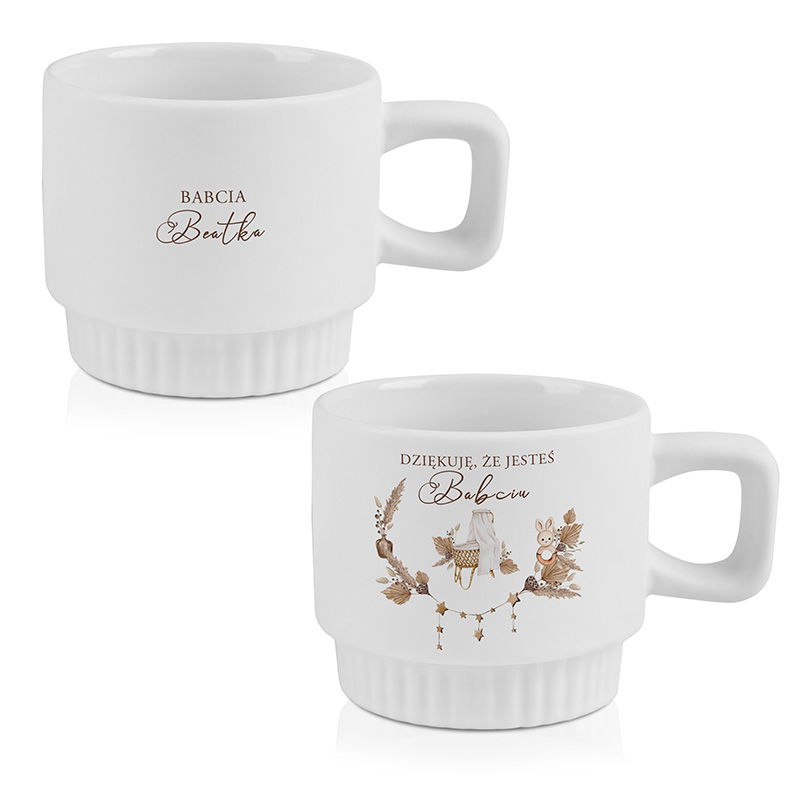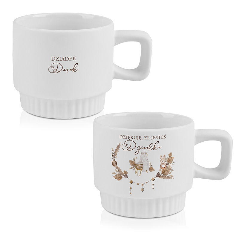 Kubek wykonany jest z wysokiej jakości ceramiki w klasycznym, białym kolorze. Dolna część posiada eleganckie ryflowanie. Na jednej części kubka znajduje się personalizowane imię Babci lub Dziadka zapisane elegancką czcionką. Z drugiej strony widnieje napis: „Dziękuję, że jesteś”, który podkreśla wyjątkową rolę Dziadków w życiu dziecka. Całość dopełnia subtelna grafika w stylu boho – z delikatnymi roślinnymi motywami, dziecięcą kołyską oraz ozdobnymi detalami w ciepłych, beżowo-brązowych tonacjach.