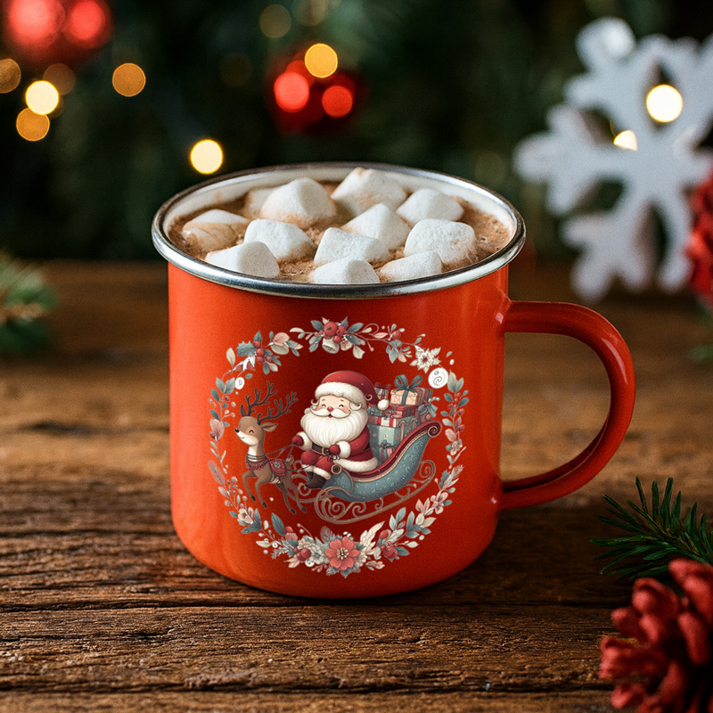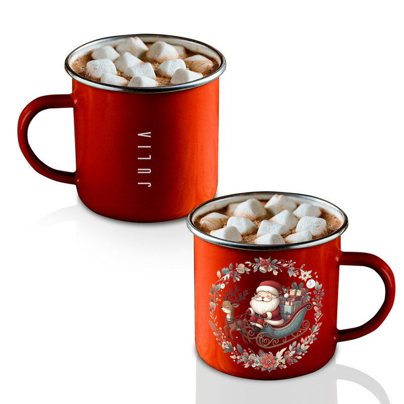 Kubek jest lekki i wytrzymały, dzięki czemu idealnie sprawdza się zarówno w domu, jak i podczas zimowych wyjazdów. Posiada klasyczny kształt z wygodnym uchem i delikatnie zaokrąglonym rantem. Czerwony kolor idealnie pasuje do świątecznego klimatu. Na kubku widnieje ilustracja Świętego Mikołaja w saniach, otoczonego świątecznym wieńcem. Po drugiej stronie kubka zostanie umieszczone imię osoby obdarowanej. Dzięki personalizacji kubek zyskuje indywidualny charakter i staje się osobistym prezentem – dla dziecka, babci, nauczycielki czy koleżanki ze szkoły.