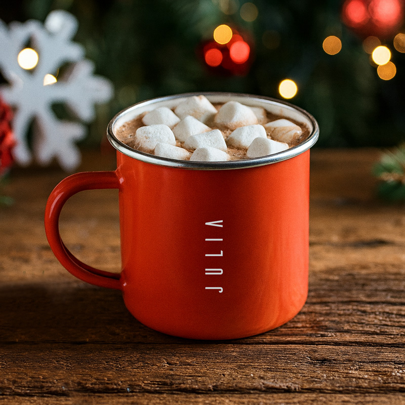 Czerwony emaliowany kubek z grafiką Świętego Mikołaja i imieniem to oryginalny prezent świąteczny. Kubek jest lekki i trwały – idealny do zimowych napojów, sprawdzi się dla dzieci i dorosłych.