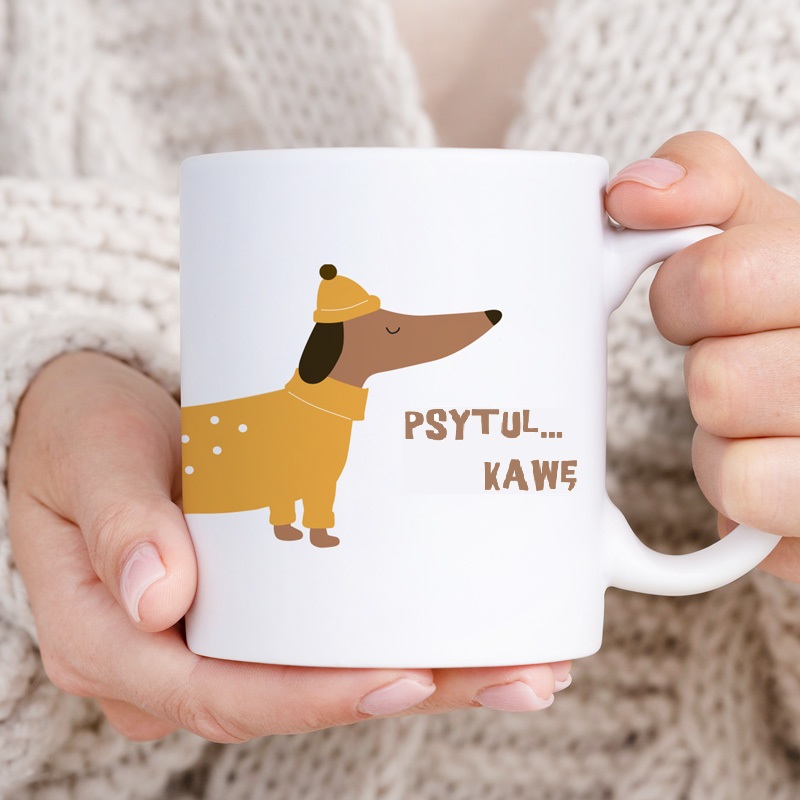 Na kubku widoczny jest jamnik w żółtym sweterku obok napisu „Dłuuuugi dzień?” z możliwością dodania imienia. Druga strona zdobi jamnik w czapce z hasłem „Psytul… kawę”. Dzięki temu kubek nie tylko cieszy oko, ale też potrafi rozbawić i poprawić humor w ciągu dnia.
