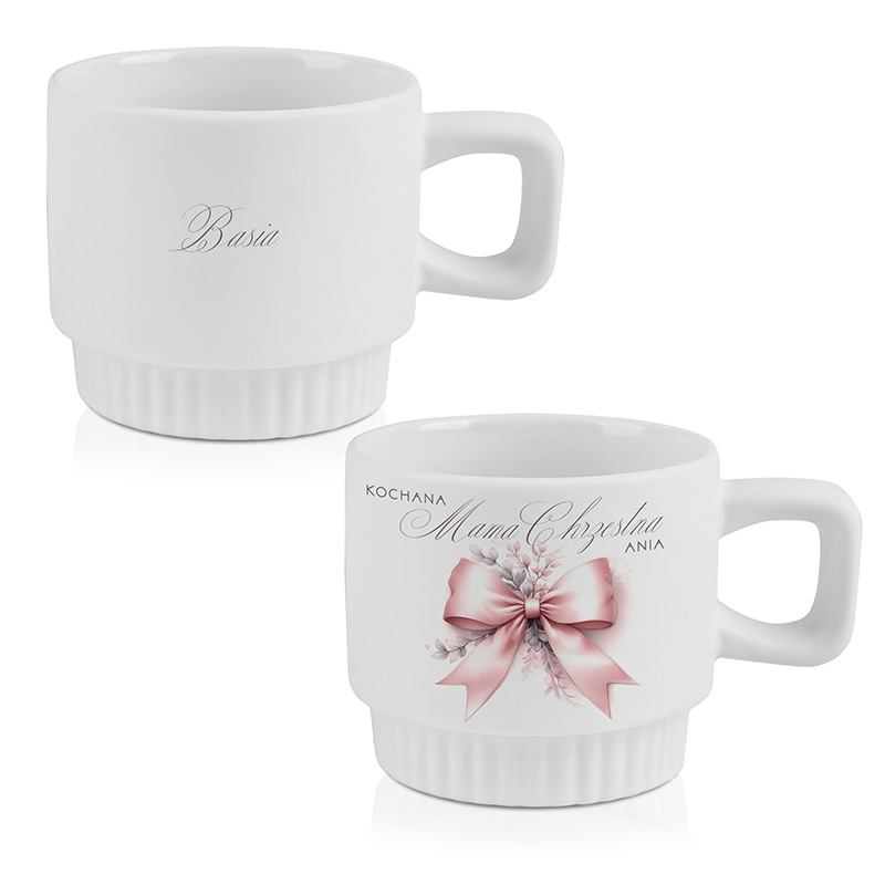 Ryflowany kubek z dedykacją dla cioci lub mamy chrzestnej to upominek, który łączy praktyczność z osobistym przekazem. Personalizowany napis i delikatna grafika idealnie wpisują się w charakter Chrztu Świętego lub Pierwszej Komunii.