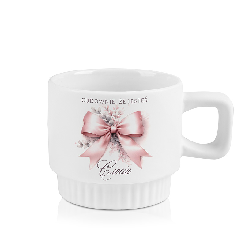 Kubek wykonany jest z ceramiki i posiada charakterystyczne ryflowanie w dolnej części, które nadaje mu nowoczesny wygląd. Na froncie znajduje się grafika z różową kokardą oraz tekst w formie podziękowania. Natomiast z drugiej strony umieszczane jest imię, co podkreśla indywidualny charakter prezentu i sprawia, że kubek jest tworzony z myślą o konkretnej osobie.