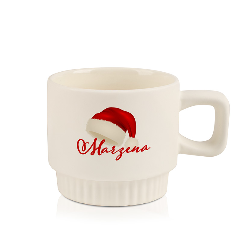 Kubek wykonany jest z wysokiej jakości ceramiki w eleganckim, kremowym kolorze z matowym wykończeniem. Jego charakterystycznym elementem jest ryflowane dno, które nadaje mu nowoczesnego i stylowego wyglądu. Na froncie kubka znajduje się czapka Świętego Mikołaja oraz personalizowany napis w formie imienia wykonany dekoracyjną czcionką w intensywnie czerwonym kolorze. Całość prezentuje się subtelnie i efektownie zarazem, dzięki czemu kubek doskonale sprawdzi się zarówno w domu, jak i w pracy. Pojemność idealna na kawę, kakao lub herbatę, a wyprofilowane ucho zapewnia wygodne trzymanie.