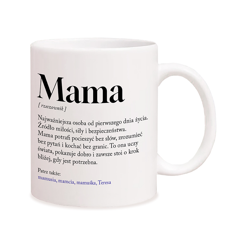 Na kubku znajduje się stylowa, minimalistyczna grafika przypominająca definicję ze słownika. Duży napis „Mama” uzupełniony jest wzruszającym opisem, który podkreśla jej rolę jako najważniejszej osoby w życiu. Całość utrzymana jest w klasycznej czerni na białym tle, co nadaje projektowi elegancji i ponadczasowego charakteru. Na dole umieszczamy imię – to właśnie ten element podlega personalizacji i sprawia, że kubek nabiera bardzo osobistego znaczenia.