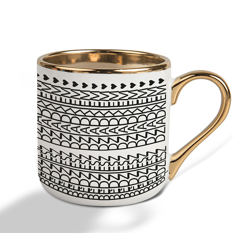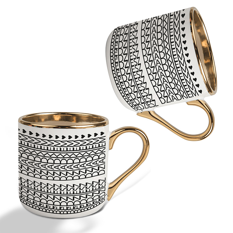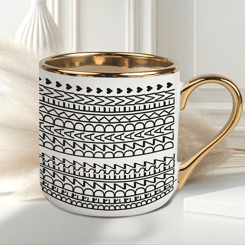 Naczynie zostało wykonane z ceramiki, która świetnie sprawdza się w codziennym użytkowaniu. Uwagę przyciągają złote detale – eleganckie ucho oraz błyszcząca obwódka na krawędzi, które dodają całości nowoczesnego charakteru. Połączenie klasycznej bieli i czerni ze złotymi akcentami sprawia, że kubek jest nie tylko praktycznym elementem codziennego użytku, ale i wygląda bardzo efektownie.