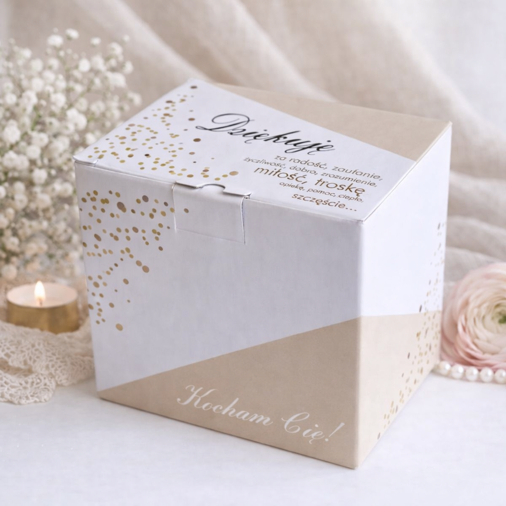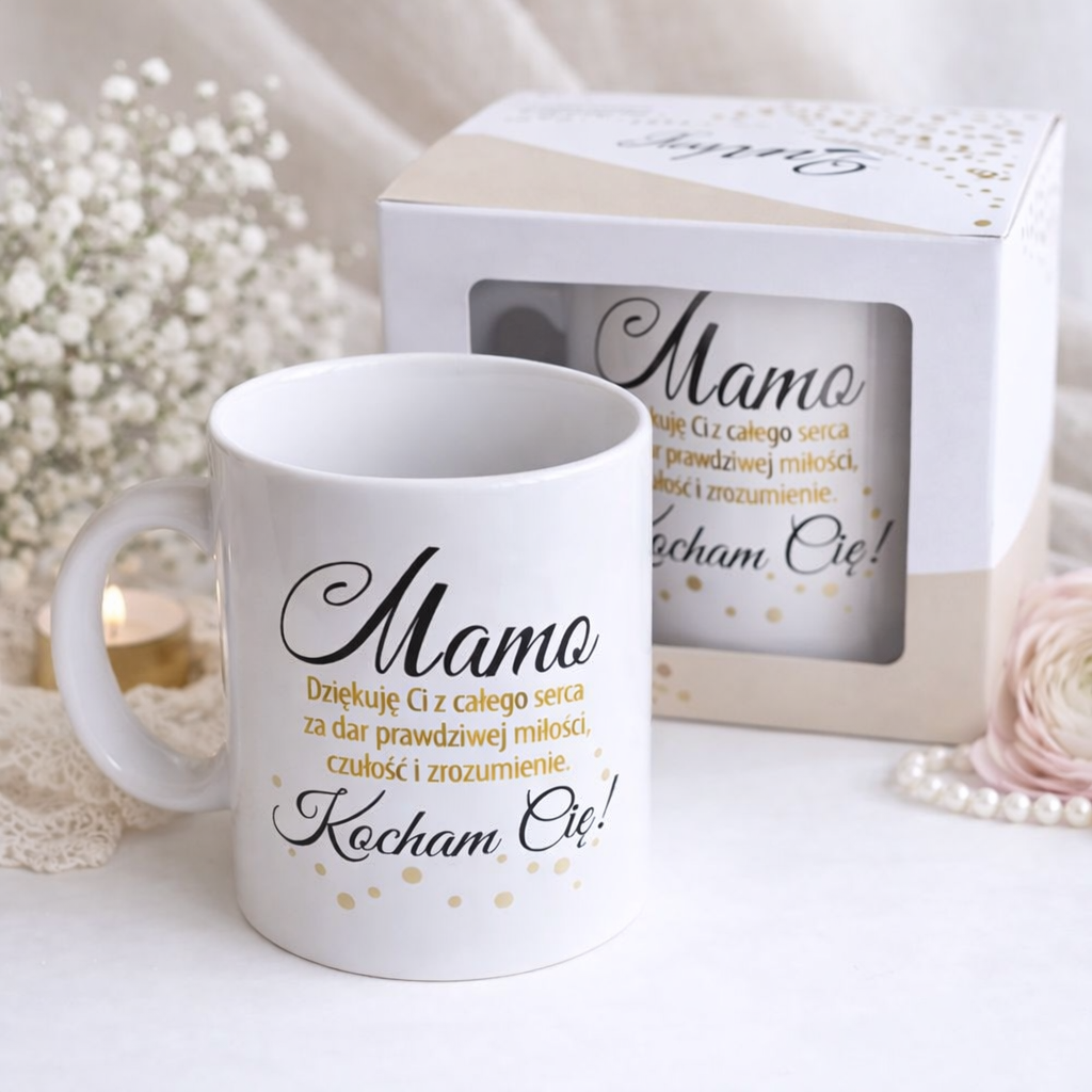Kubek utrzymany jest w klasycznej, białej kolorystyce, która doskonale podkreśla elegancki charakter złoto-czarnego nadruku. Na jego powierzchni znajduje się wzruszający tekst podziękowania dla mamy, zapisany ozdobną czcionką, z wyróżnionymi złotymi akcentami oraz subtelnymi dekoracyjnymi kropkami. Całość prezentuje się niezwykle stylowo i kobieco. Produkt zapakowany jest w estetyczne, dopasowane pudełko, dzięki czemu od razu jest gotowy do wręczenia jako prezent.
