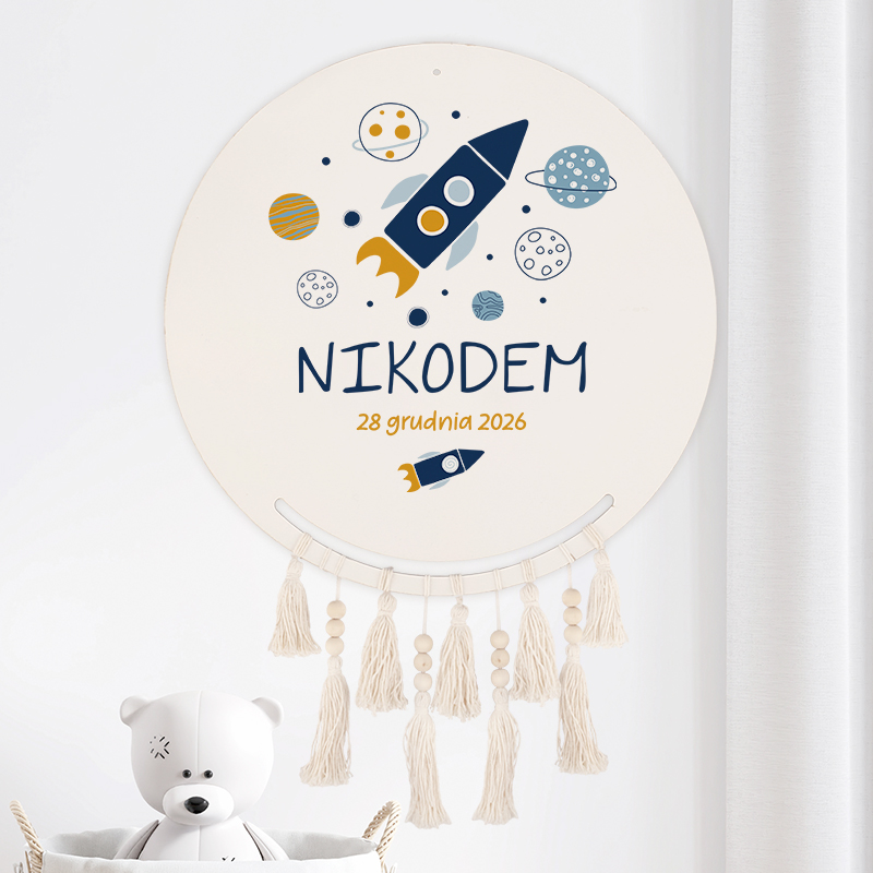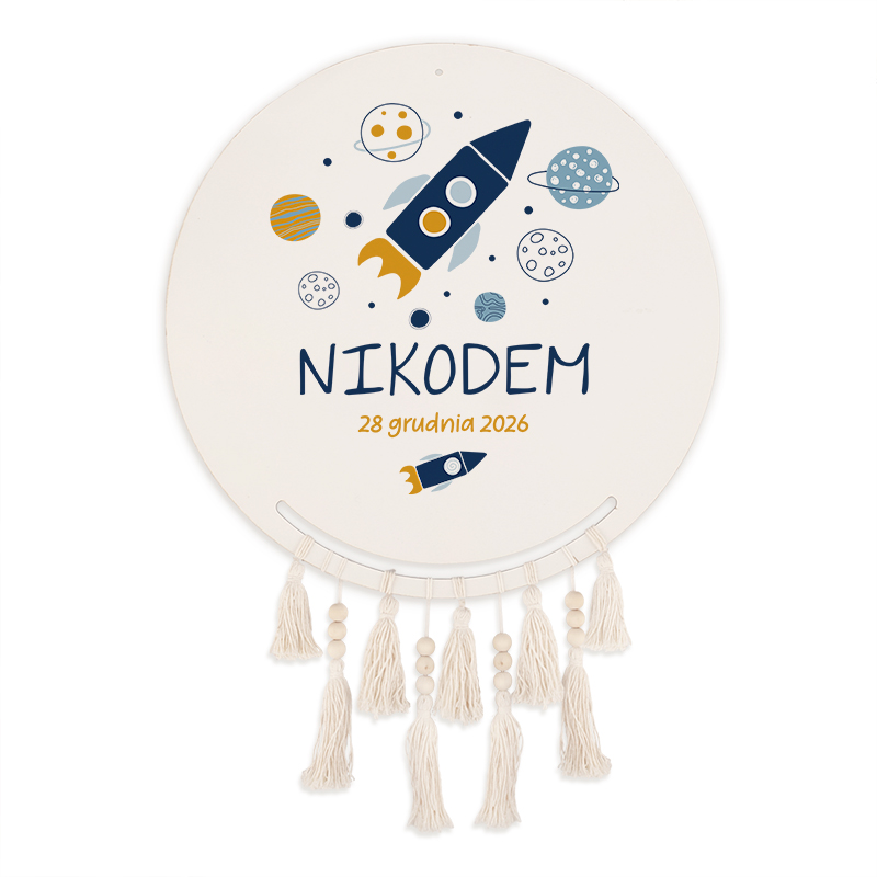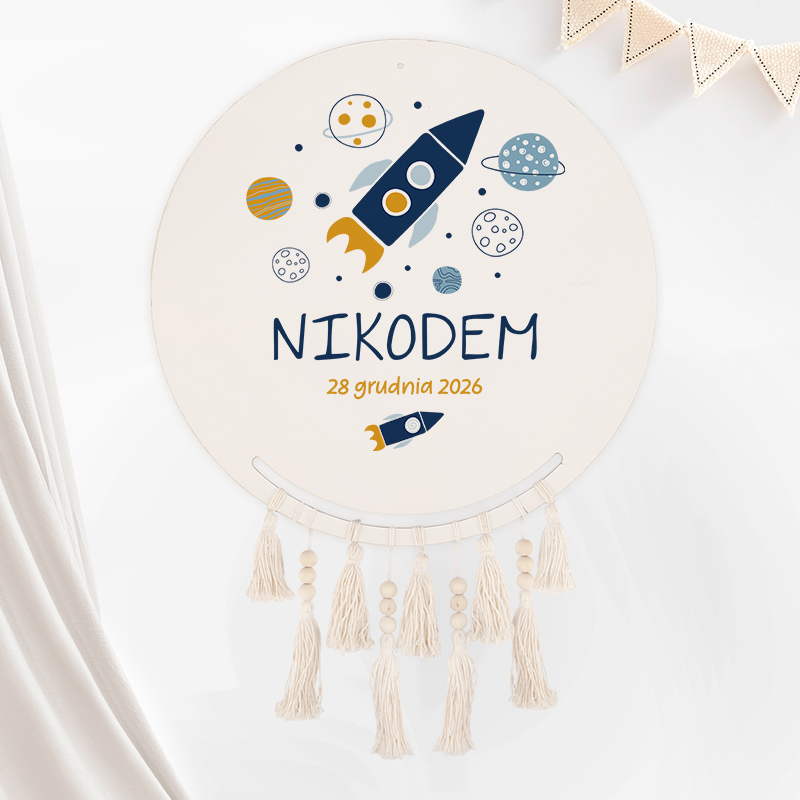 - Łapacz snów wykonany jest na drewnianej i okrągłej tarczy. Dekorację wzbogacimy o ozdobne frędzelki. Na tarczy umieścimy grafikę, która pochodzi z kolekcji Kosmiczne Przygody, zawiera ona takie elementy graficzne jak rakietę kosmiczną oraz planety. Personalizacja obejmuje imię małego astronauty oraz datę urodzenia. Łapacz snów posiada dziurkę do zawieszenia.