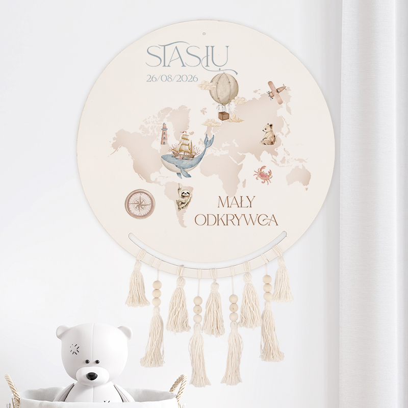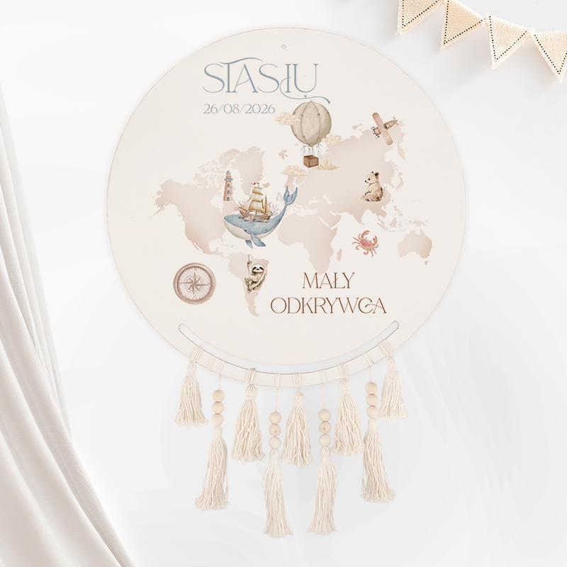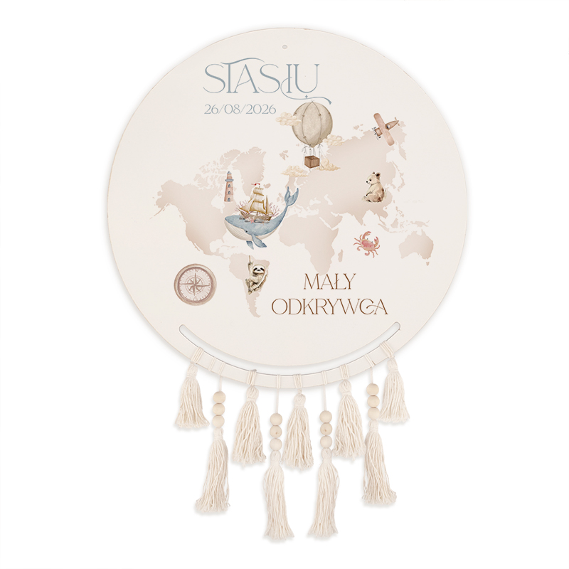 - Modna dekoracja do pokoju maluszka, która będzie oryginalnym elementem na ścianie w dziecięcej przestrzeni. Łapacz snów składa się z okrągłej, drewnianej tarczy oraz wiszących zawieszek w kształcie piórek, które z największą starannością stworzyły rękodzielniczki. Na powierzchni drewnianej tarczy znajduje się dekoracja z motywem przewodnim kolekcji o nazwie Mały Odkrywca. Hasłem kolekcji są słowa skierowane do dziecka, które znajdą się w górnej części łapacza: PODRÓŻUJ ZDOBYWAJ ODKRYWAJ. Poniżej haseł znajduje się mapa fizyczna świata w czarnym kolorze, który wyróżnia się na białym tle. Nadruk na tarczy wieńczy zaokrąglona na rogach ramka, której wnętrze personalizowany napis: IMIĘ + MAŁY ODKRYWCA.