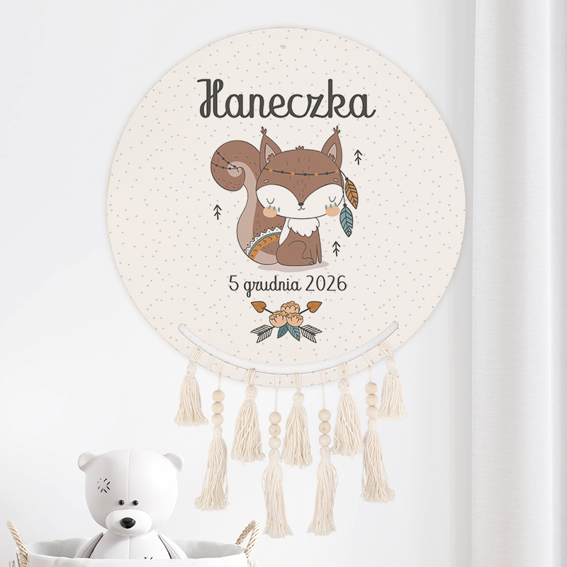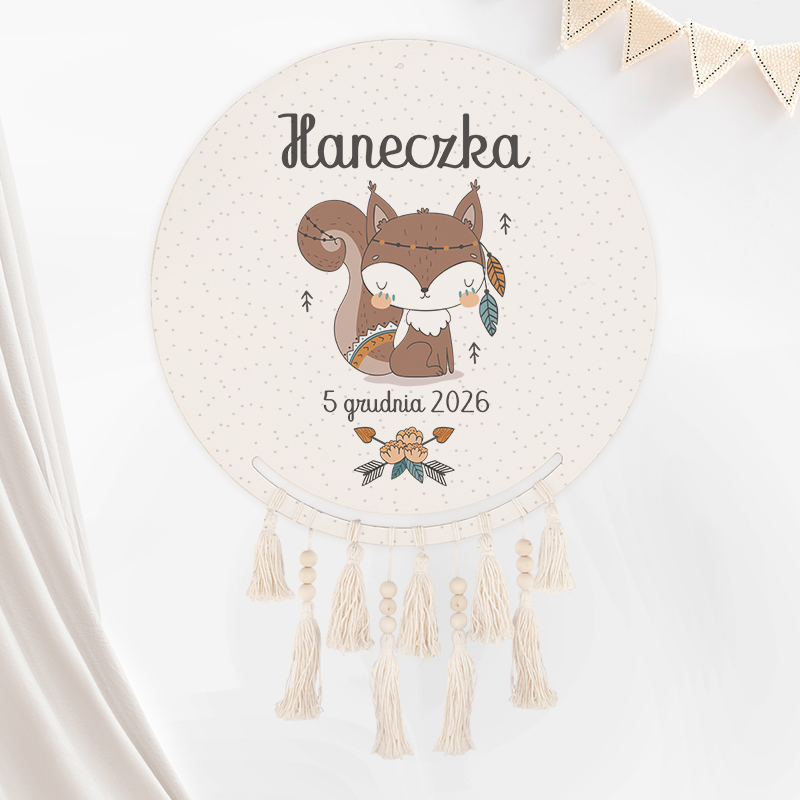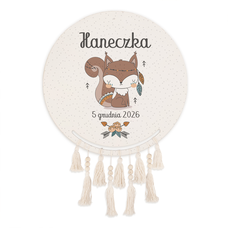 - Łapacz snów to niezwykła dekoracja wisząca do pokoju dziecka. Został wykonany na okrągłej, drewnianej tarczy, która wzbogacona jest o dekorację w postaci frędzelków. Na tarczy umieścimy grafikę z kolekcji Wiewióreczka, motyw graficzny jest w jasnej kolorystyce. Dekoracyjną czcionką wykonamy personalizację w postaci imienia dziecka oraz daty urodzenia.