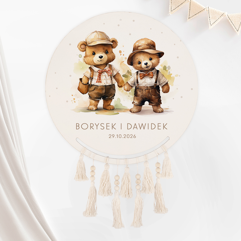 Poniżej misiów umieszczono imiona dzieci oraz datę urodzenia, co czyni tę dekorację osobistą i unikalną. Łapacz snów wykonany jest z wysokiej jakości materiałów, co gwarantuje jego trwałość i estetyczny wygląd przez długi czas. Delikatne frędzle dodają całości lekkości i elegancji, tworząc subtelną dekorację, która doskonale wpasuje się w dziecięcy pokój. To idealny sposób na dodanie osobistego akcentu do wnętrza, który będzie jednocześnie pamiątką z pierwszych dni życia Twoich maluszków. To doskonały pomysł na prezent – na narodziny, chrzciny lub pierwsze urodziny bliźniaków. Taki łapacz snów z pewnością zachwyci rodziców i stanie się nieodłącznym elementem dekoracyjnym w pokoju dzieci.