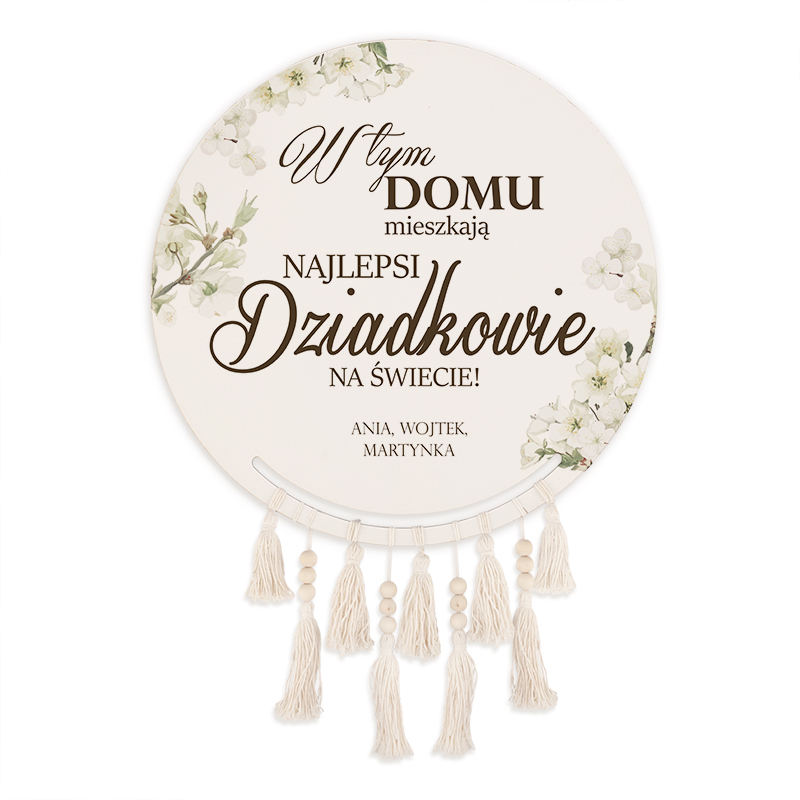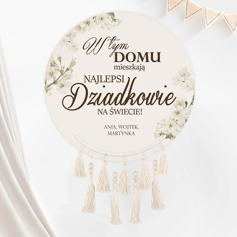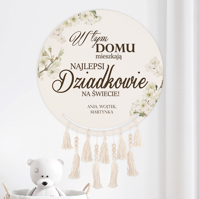 Okrągła dekoracja ścienna z napisem "W tym DOMU mieszkają najlepsi Dziadkowie na świecie!" i imionami Ania, Wojtek, Martynka, ozdobiona kwiatowym wzorem oraz frędzlami na dole.