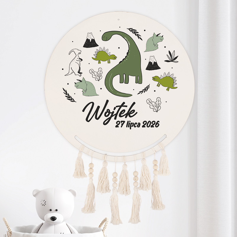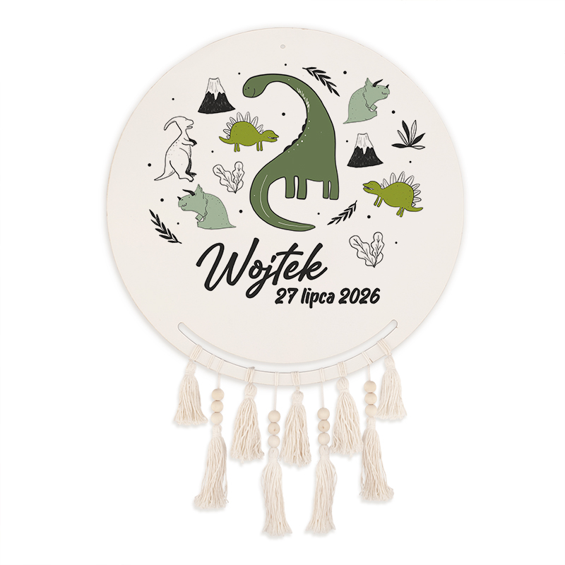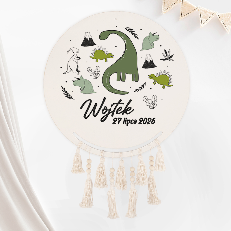 - Łapacz snów do zawieszenia w pokoju dziecka. Na okrągłej tarczy z jasnego drewna umieściliśmy super trwały nadruk, przedstawiający wesołą gromadkę dinozaurów, ilustrowane wulkany i roślinki. Całość ujęta została w uroczych odcieniach zieleni, bieli i czerni. Poniżej umieścimy imię oraz datę urodzenia dziecka.